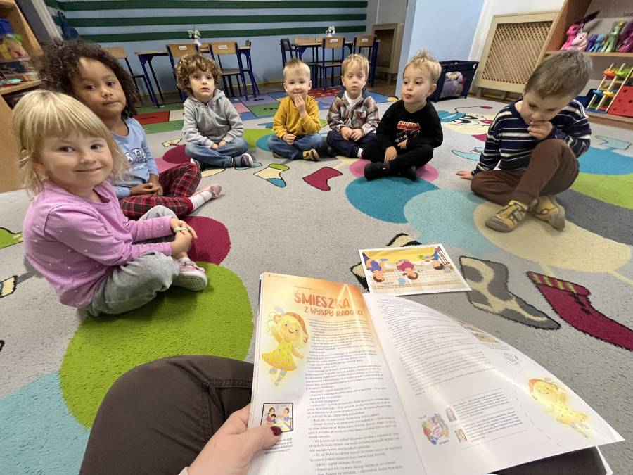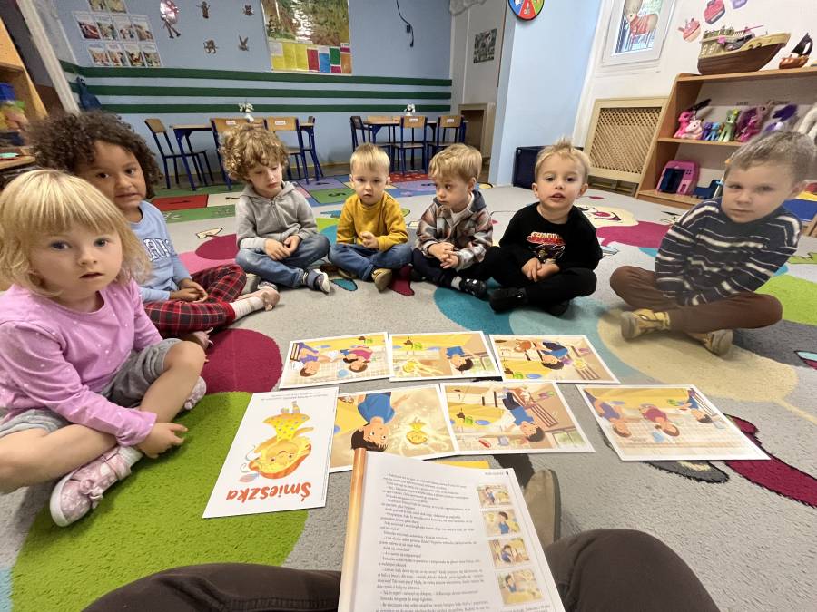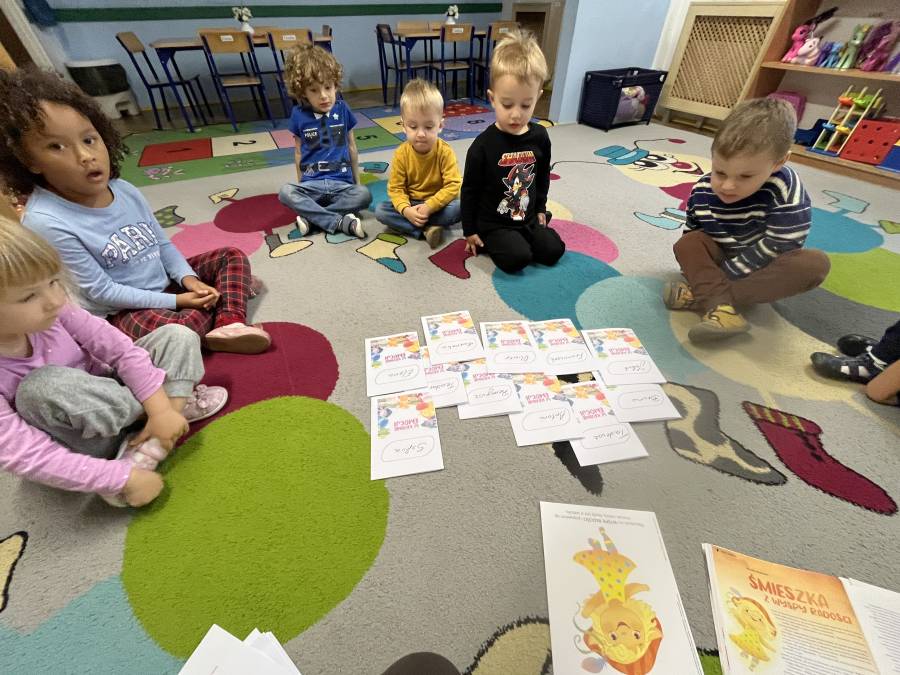 Pierwszą emocją, którą poznaliśmy, była radość- Śmieszka. Dzieci dzięki przeczytanemu fragmentowi opowiadania mogły dowiedzieć się czym jest radość, po czym można ją poznać oraz w jaki sposób można dzielić się uśmiechem z innymi.