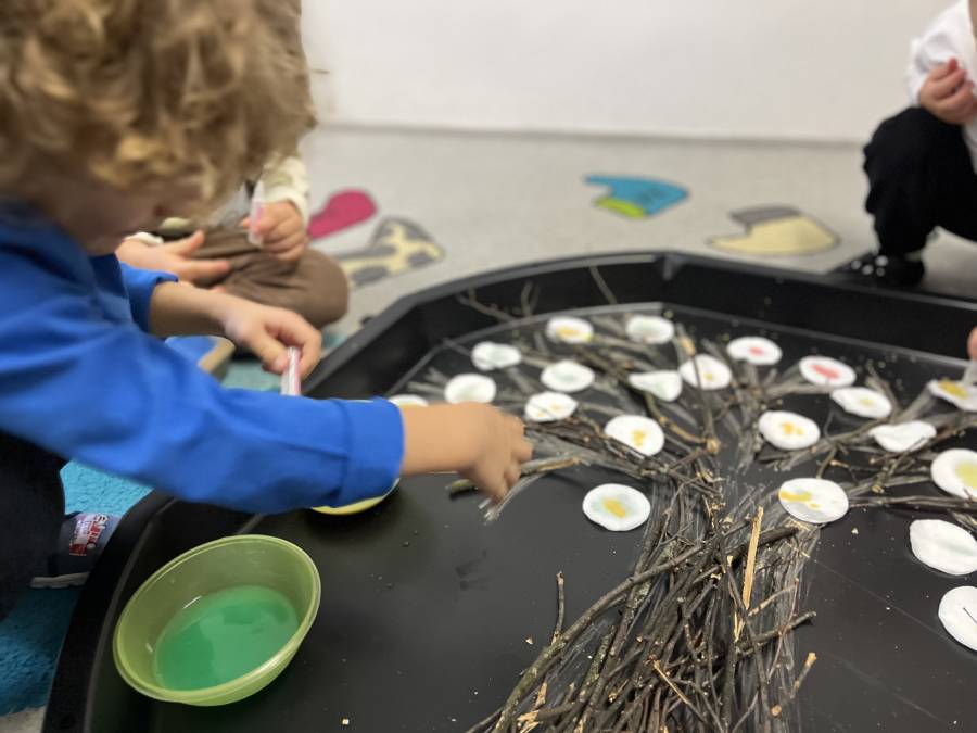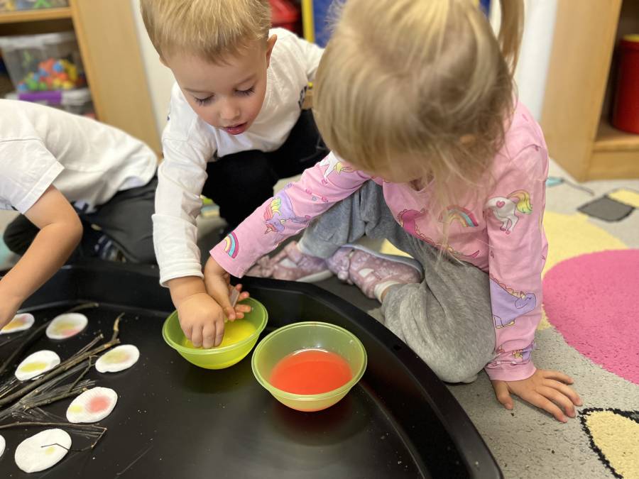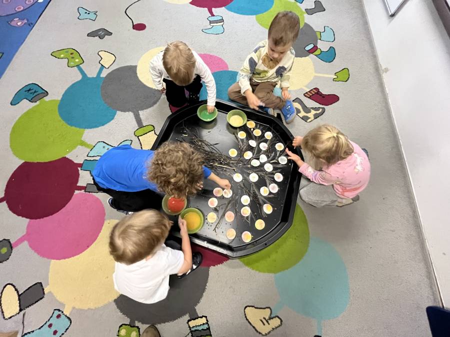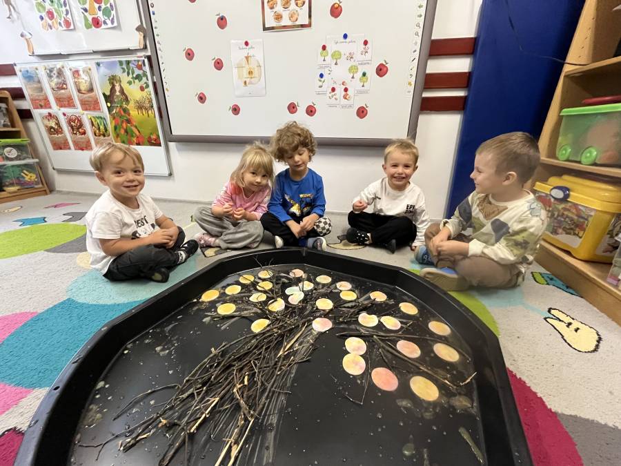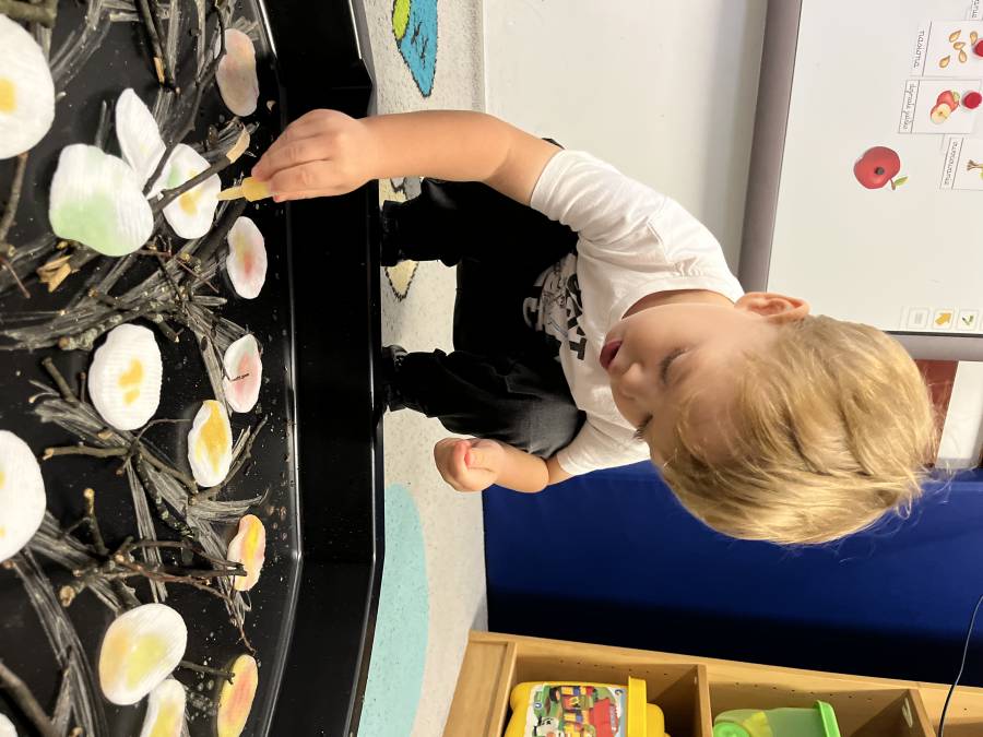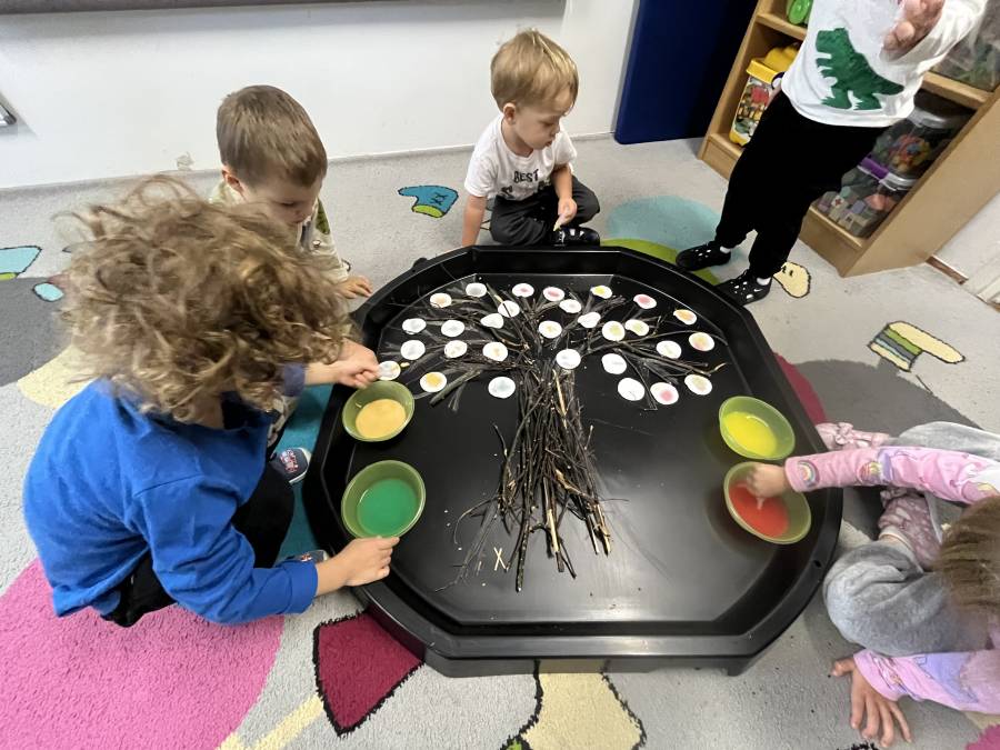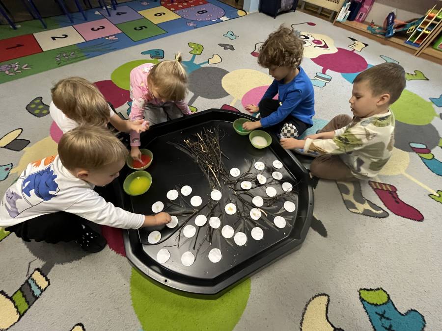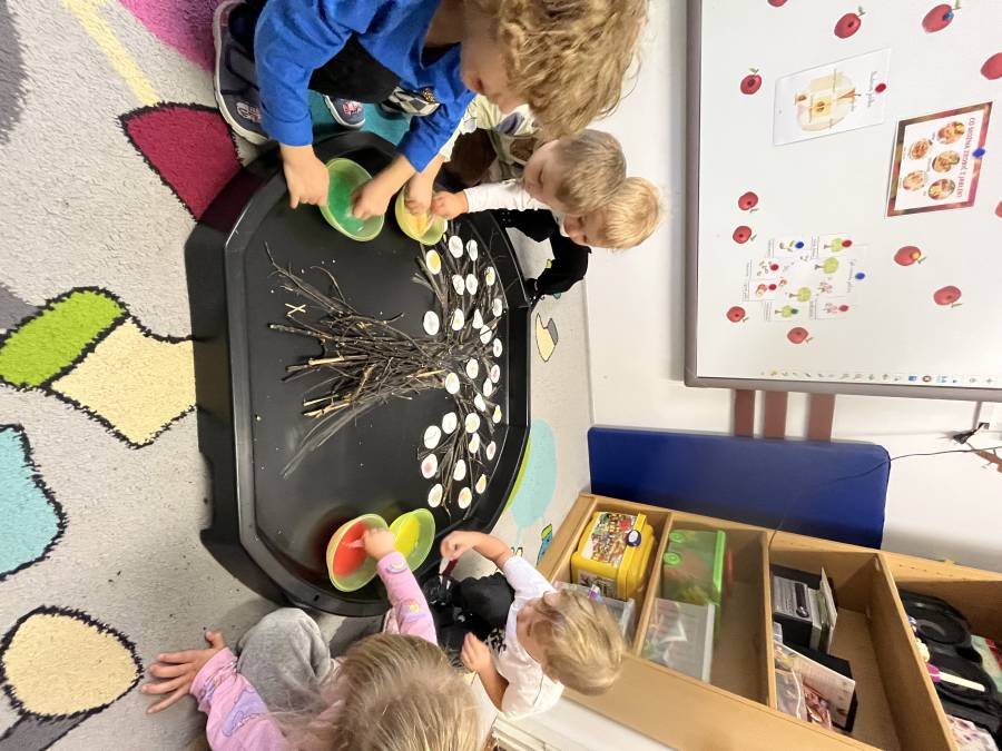 W miniony piątek tj. 26.09.2025r grupa „Skrzaty” miała po raz pierwszy przyjemność pracować z tacą wielorakich aktywności. Taca aktywności jest to duża, wytrzymała taca, służąca jako podstawa do różnorodnych zabaw edukacyjnych i sensorycznych, takich jak zabawy z piaskiem, wodą, masami plastycznymi czy segregowaniem drobnych przedmiotów. My naszą tacę wielorakich aktywności użyliśmy do stworzenia pracy plastycznej pt. „Jesienne drzewo”.