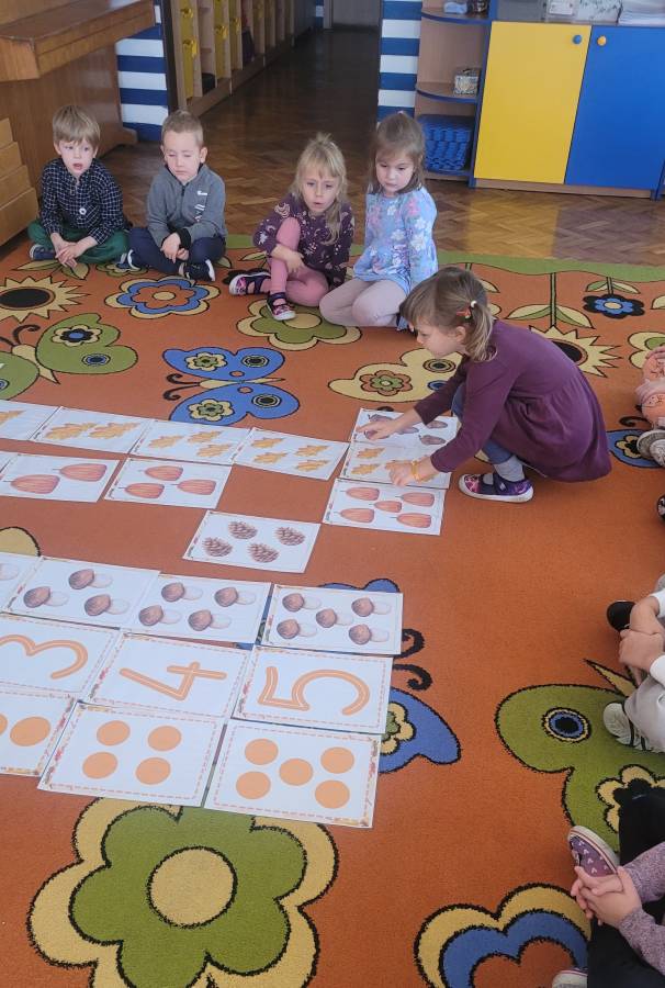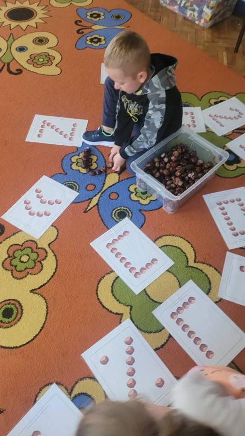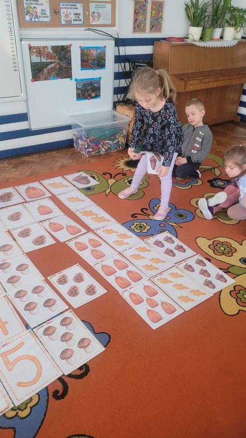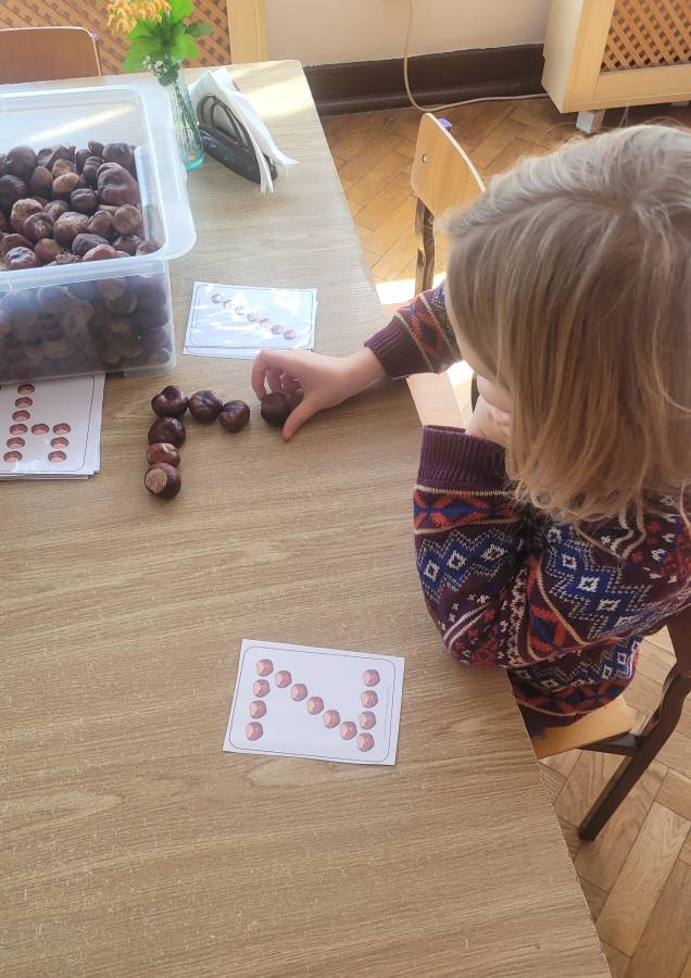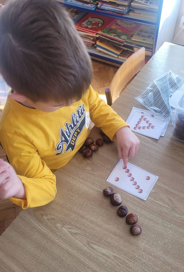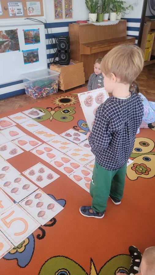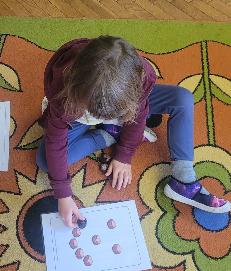Nie zabrakło także kodowania skarbów jesieni – dzieci układały liście, kasztany i żołędzie według kolorów, kształtów i ilości, rozwijając logiczne myślenie i umiejętność klasyfikowania.