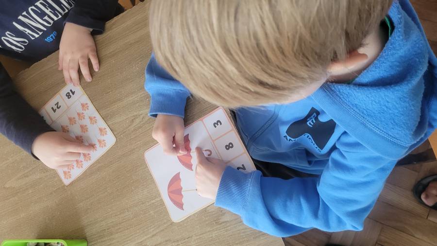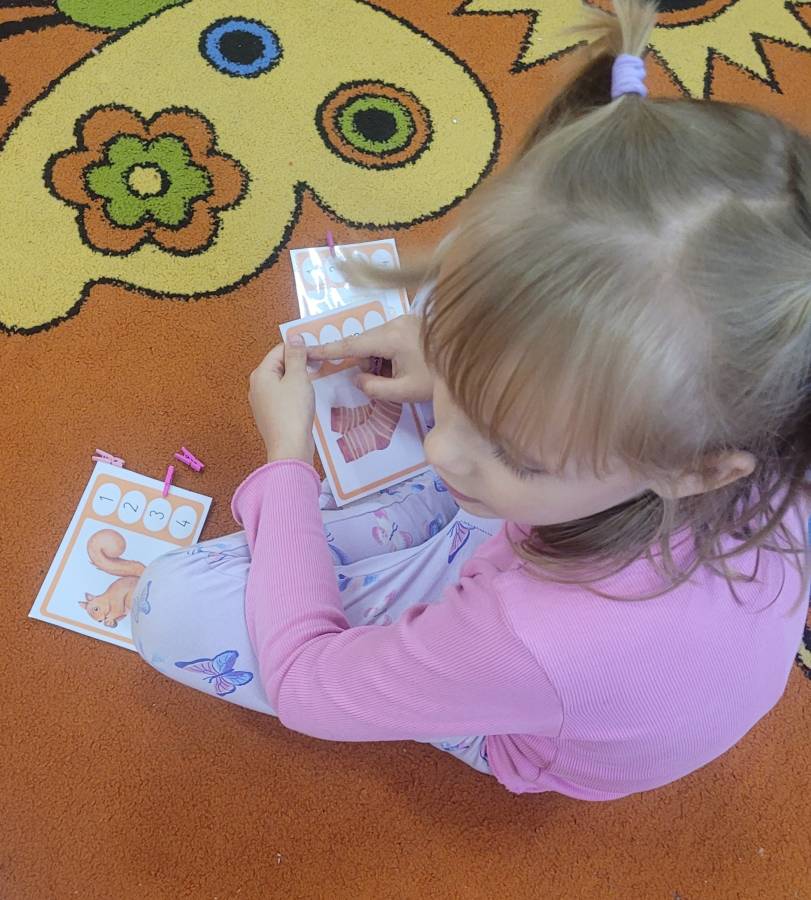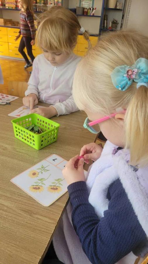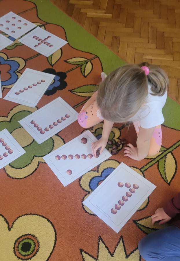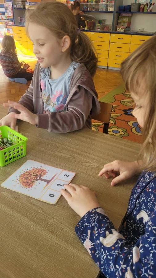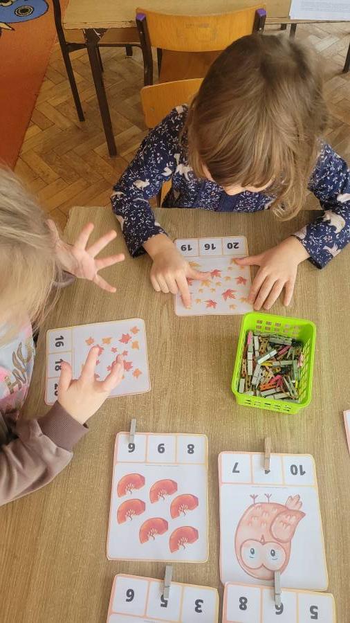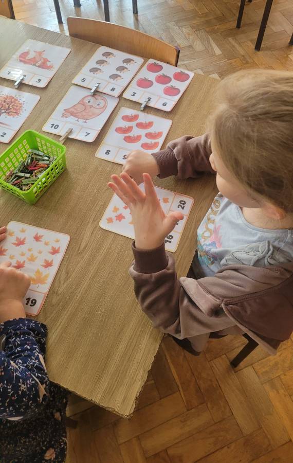 Nie zabrakło także kodowania skarbów jesieni – dzieci układały liście, kasztany i żołędzie według kolorów, kształtów i ilości, rozwijając logiczne myślenie i umiejętność klasyfikowania.