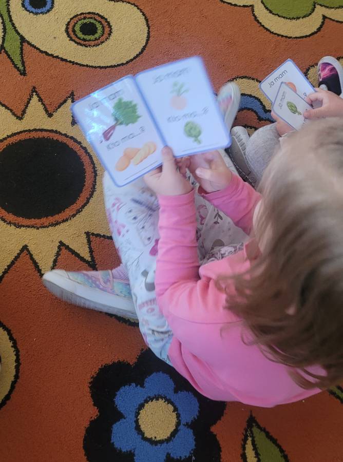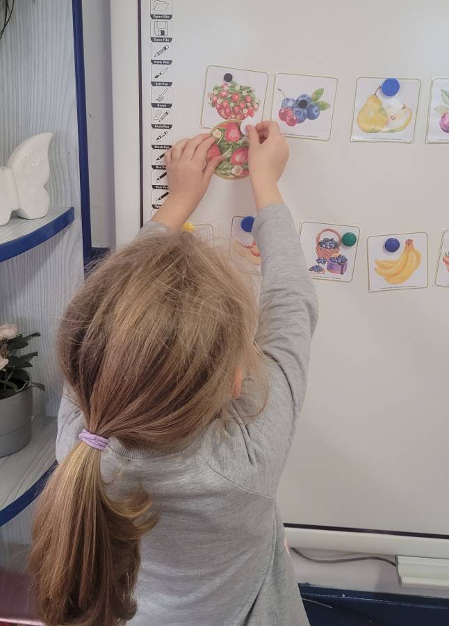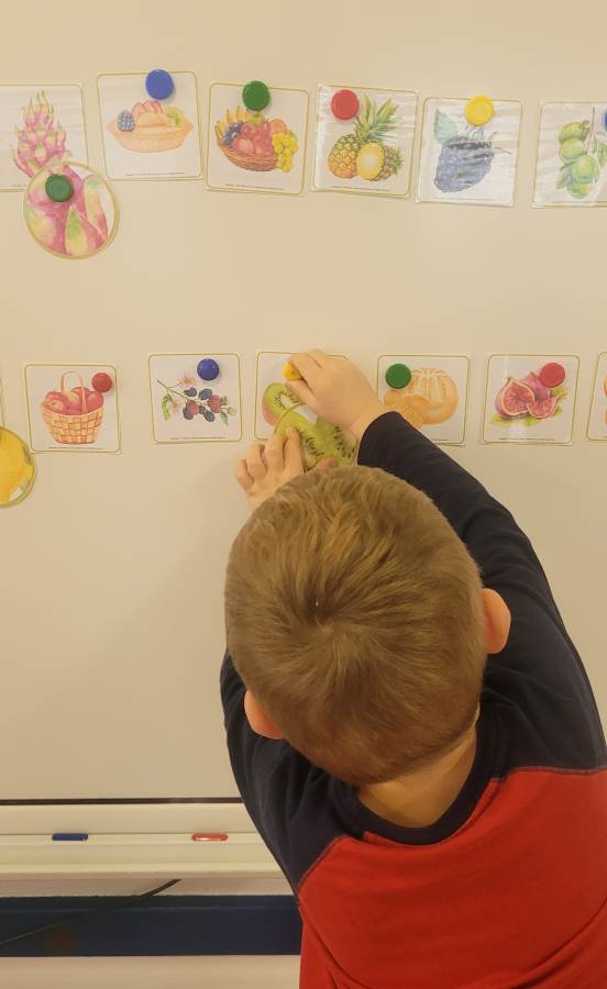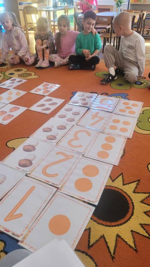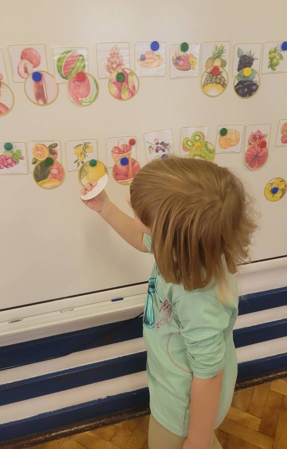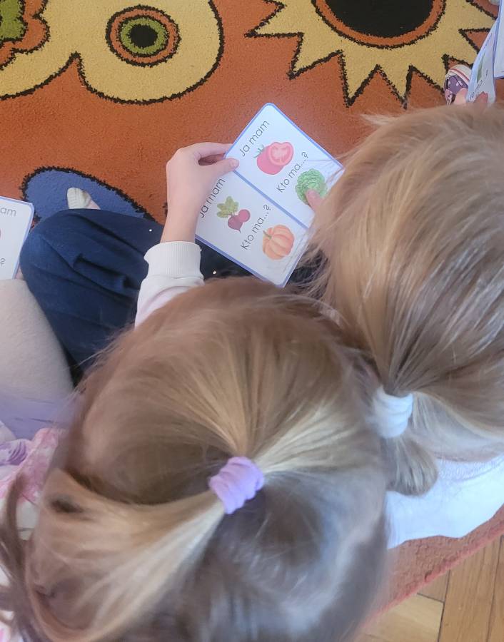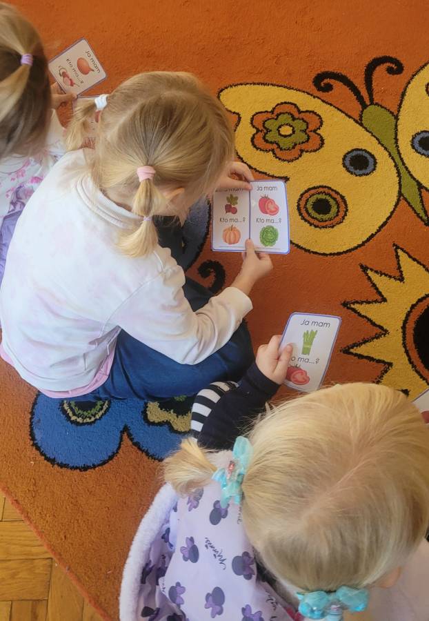 Wśród ulubionych zabaw znalazła się gra „Ja mam… Kto ma?”, podczas której przedszkolaki utrwalały nazwy warzyw i owoców, ćwicząc jednocześnie koncentrację i słuchanie poleceń kolegów.