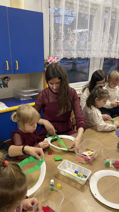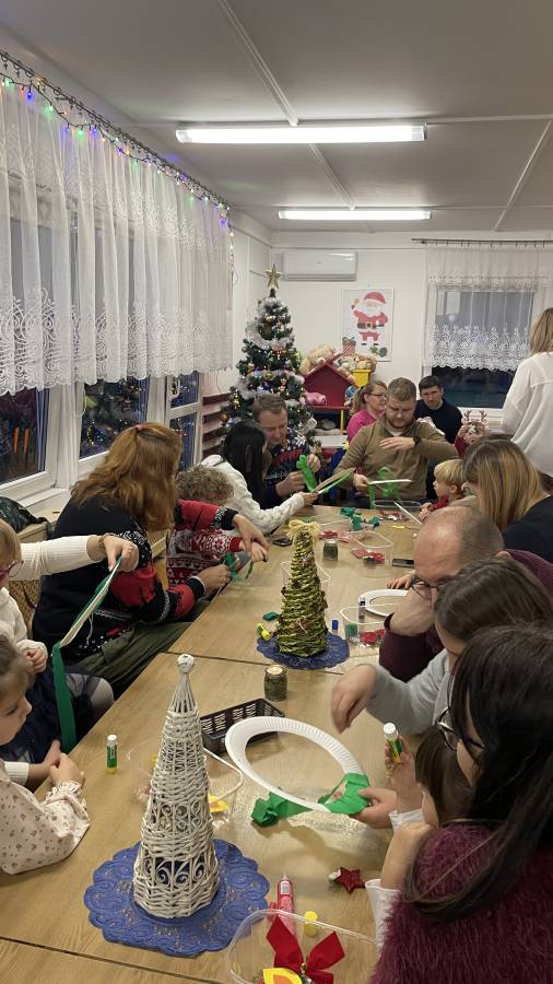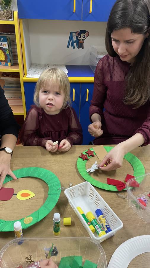 W drugiej części spotkania dzieci wraz ze swoimi Rodzinami wzięły udział w warsztatach plastycznych . Z rozmaitych materiałów dekoracyjnych powstały przepiękne, kolorowe wieńce świąteczne. Radości i uśmiechu nie zabrakło na twarzach zarówno dzieci, jak i Rodziców. To było naprawdę niesamowite i pełne wrażeń spotkanie w ciepłej , świątecznej atmosferze.