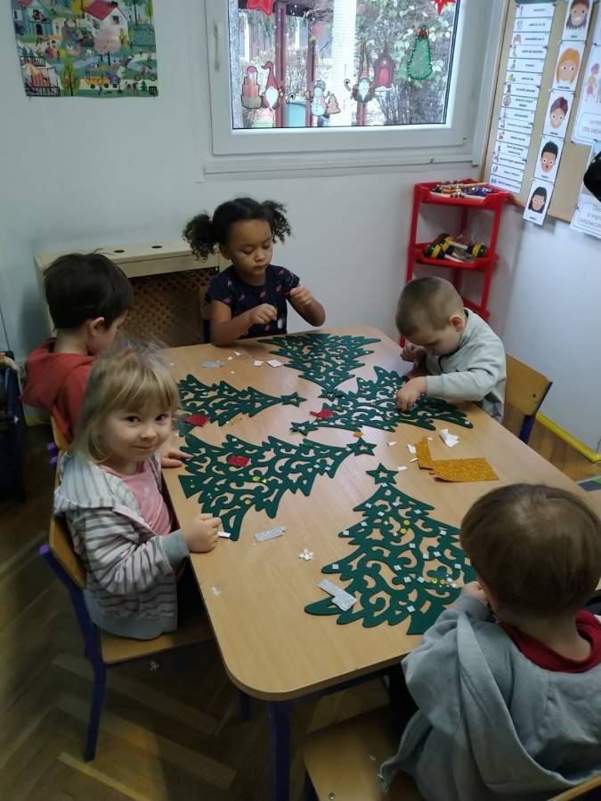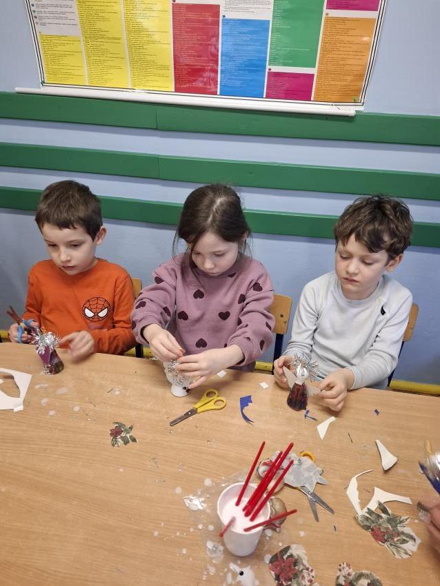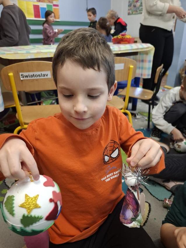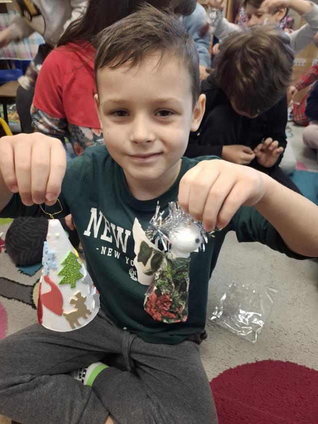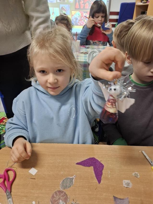W okresie przedświątecznym w naszym przedszkolu odbyły się warsztaty plastyczne z okazji Świąt Bożego Narodzenia. W zajęciach kolejno uczestniczyły wszystkie grupy przedszkolne. Dzieci z ogromnym zaangażowaniem i radością wykonywały własnoręcznie ozdoby świąteczne, wykorzystując różnorodne materiały plastyczne. Powstały piękne bombki, łańcuchy, choinki oraz inne dekoracje, które wprowadziły do przedszkola wyjątkową, świąteczną atmosferę. Warsztaty były doskonałą okazją do rozwijania kreatywności, zdolności manualnych oraz współpracy w grupie, a także do kultywowania tradycji bożonarodzeniowych.
