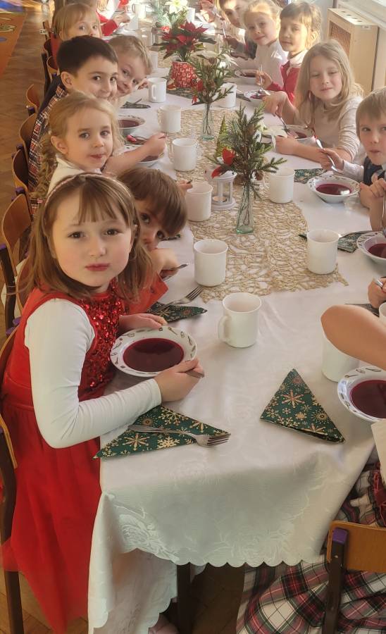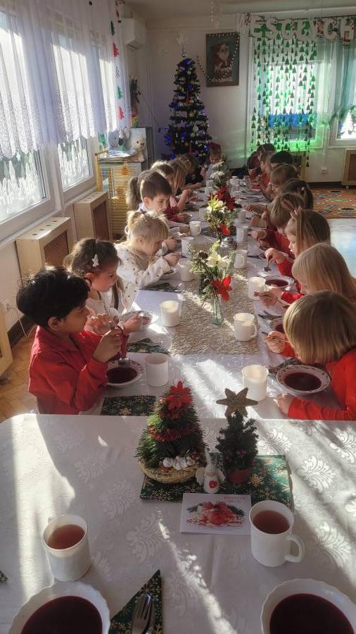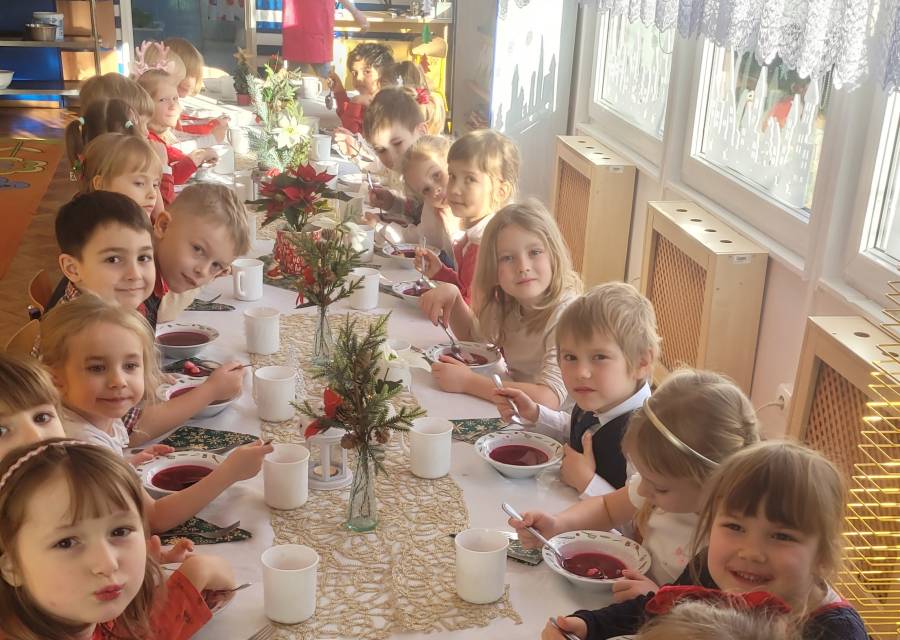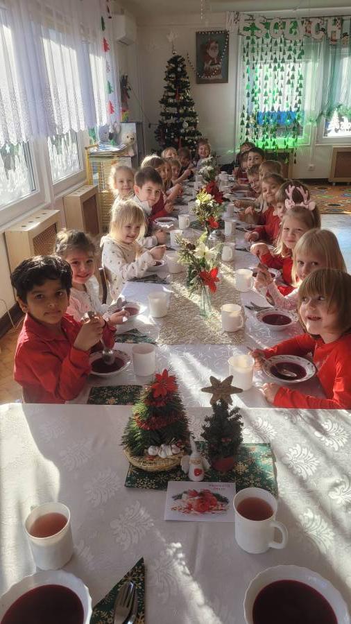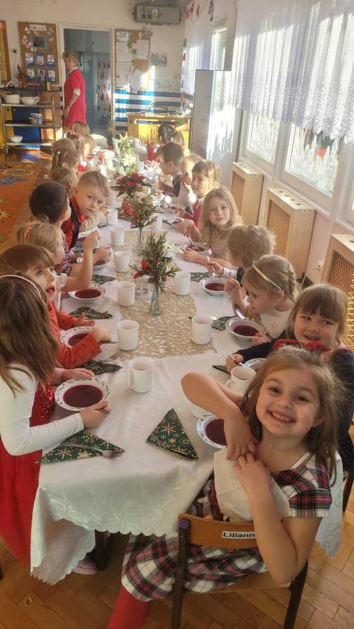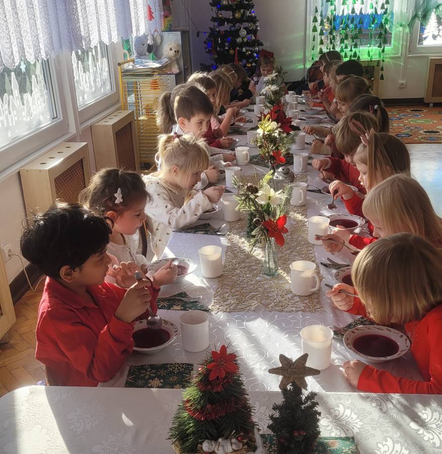 19 grudnia w grupie Motylków odbył się uroczysty wigilijny obiad. Dzieci, ubrane odświętnie, zasiadły przy wspólnym stole, tworząc ciepłą i radosną atmosferę sprzyjającą rozmowom o tradycjach bożonarodzeniowych.