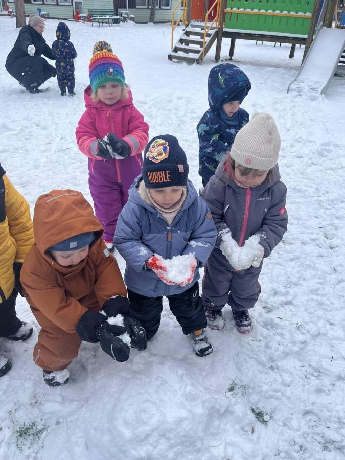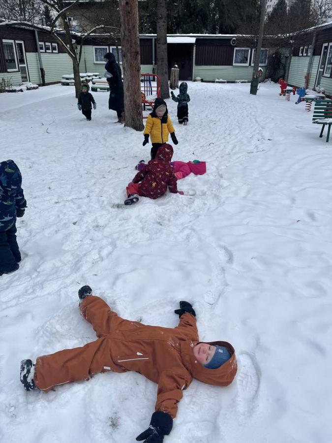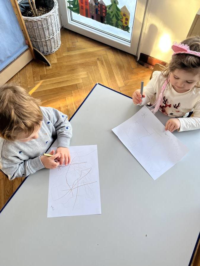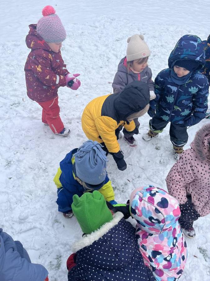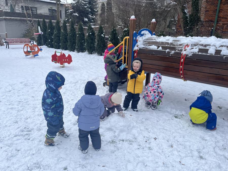 Podczas zabaw na śniegu dzieci lepiły małe kule, chodziły po śnieżnym dywanie, obserwowały ślady pozostawione przez buty oraz poznawały, jaki w dotyku jest śnieg. Takie aktywności nie tylko sprawiły im ogromną radość, ale również wspierały rozwój motoryki dużej, koordynacji ruchowej oraz zmysłów. Dzieci uczyły się także współpracy i dzielenia się radością z innymi.