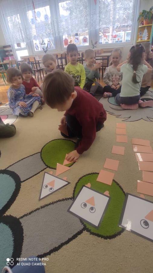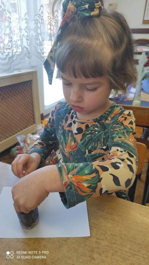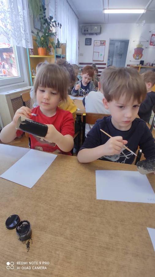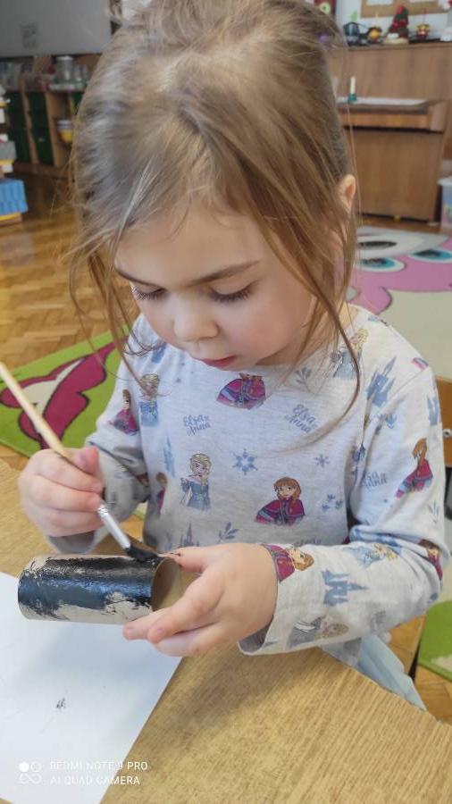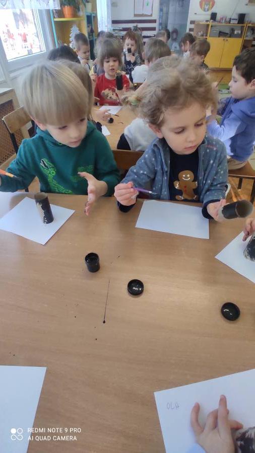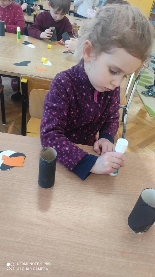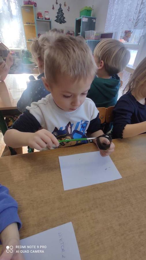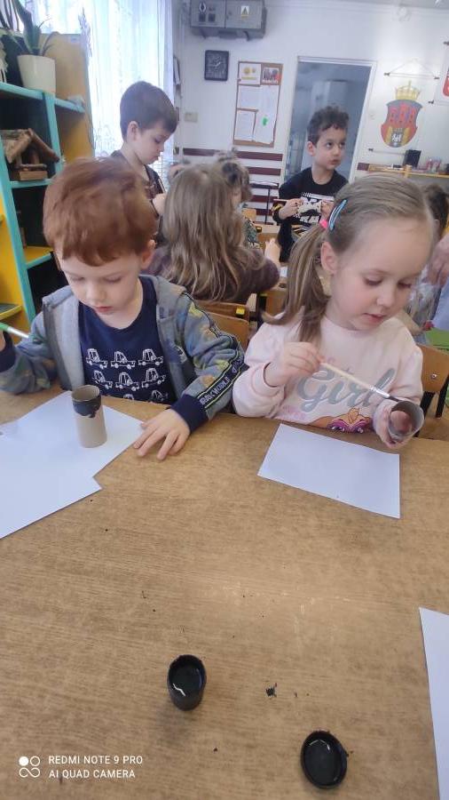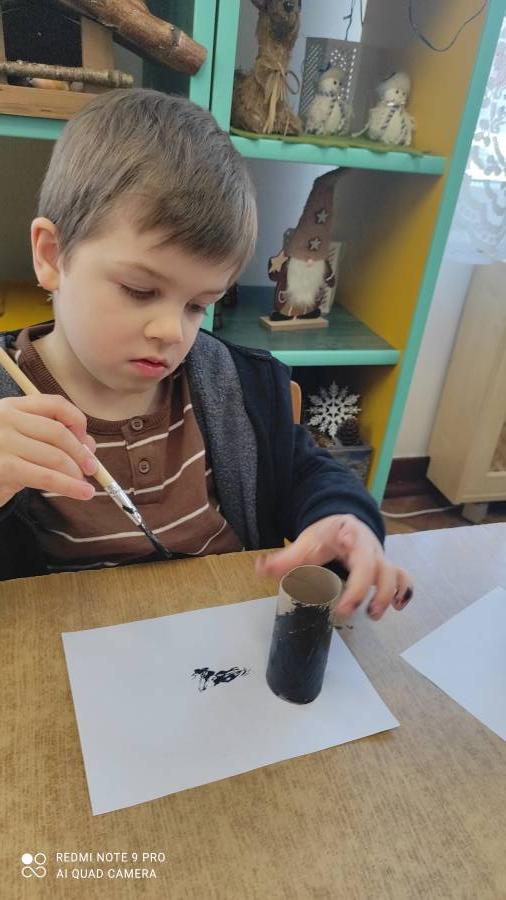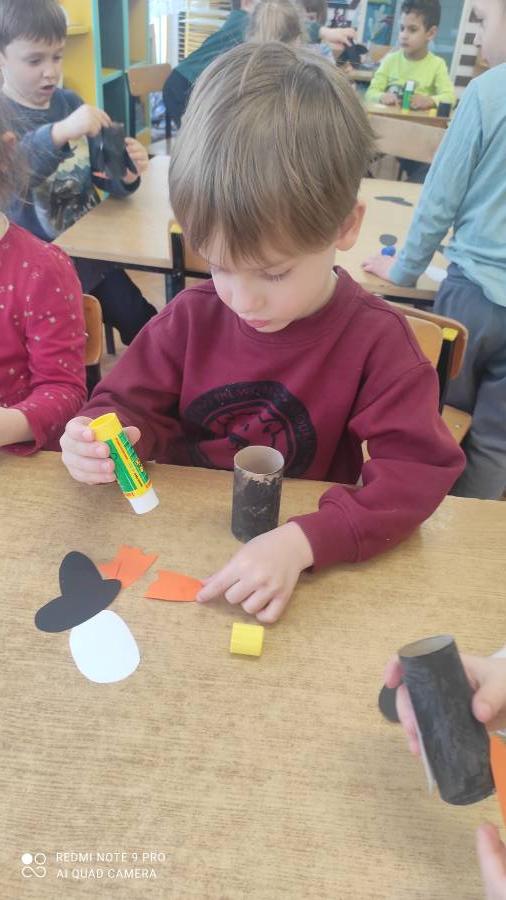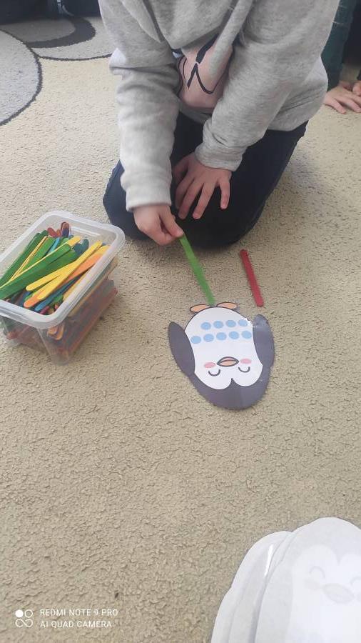 Dzieci malowały rolki na czarno i biało, a następnie przyklejały skrzydełka, stópki oraz oczy, tworząc własne, niepowtarzalne pingwiny. Zadanie to rozwijało sprawność manualną, kreatywność oraz umiejętność koncentracji.