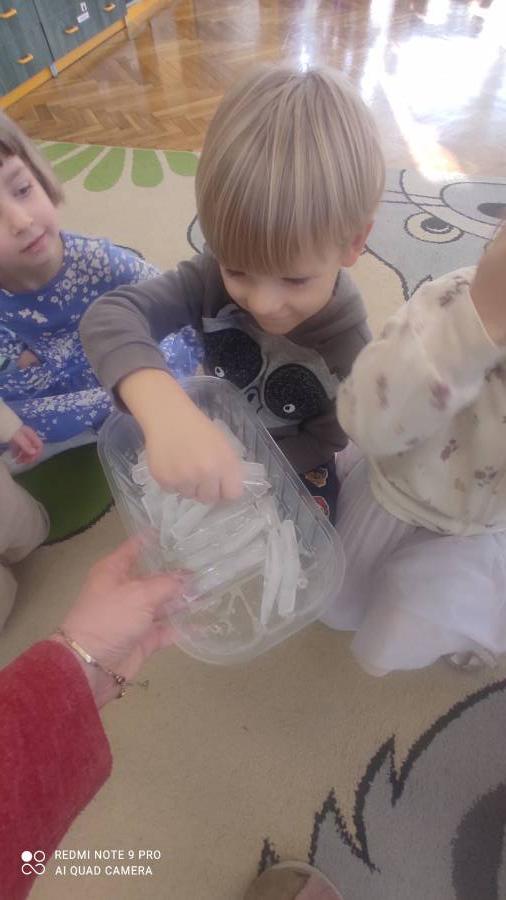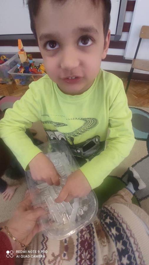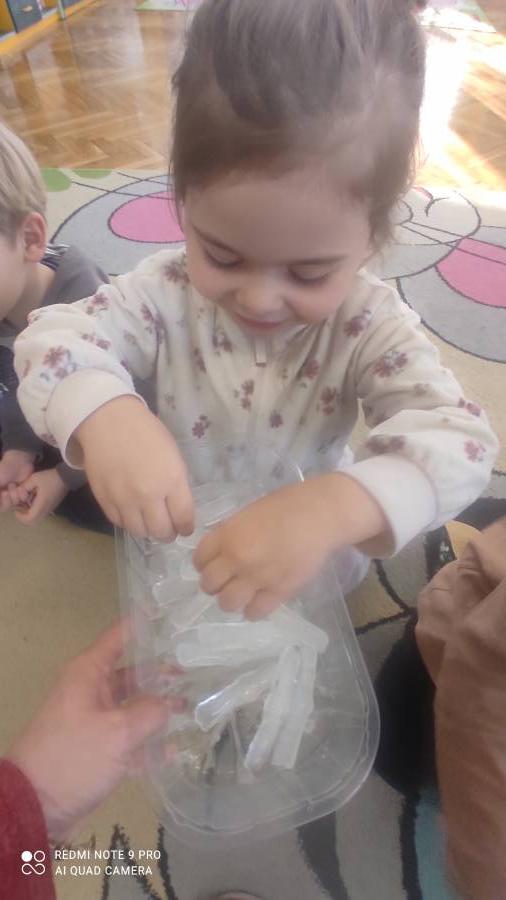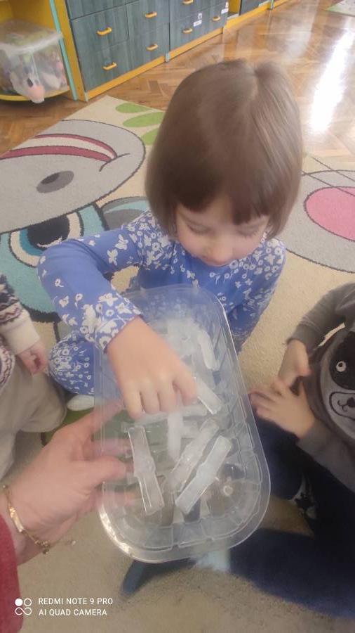 Pierwsza aktywność polegała na dotykaniu prawdziwego lodu. Dzieci obserwowały jego zimną strukturę, a także zmiany zachodzące pod wpływem ciepła dłoni. Dzięki temu doświadczeniu mogły lepiej wyobrazić sobie warunki panujące w naturalnym środowisku pingwinów oraz rozwijały zmysł dotyku.