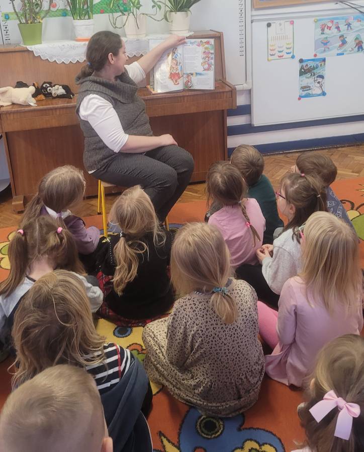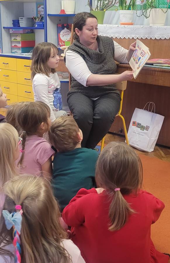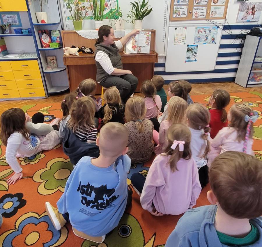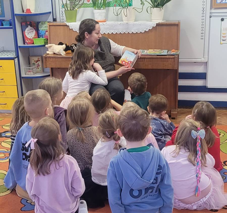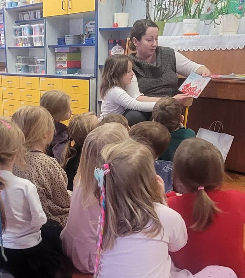 26 stycznia, w ramach akcji „Cała Polska Czyta Dzieciom”, grupę Motylków odwiedziła pani Joanna – mama Lenki. Przeczytała dzieciom krótkie, rymowane historyjki z książki pt. „Na łące” Anny Edyk-Psuł oraz opowiadania: „Mój najlepszy przyjaciel i ja. Kuba i Filuś”, „Tańcowała igła z nitką”, „Kicia Kocia sprząta” oraz „Kicia Kocia na lotnisku” autorstwa Anity Głowińskiej. To już kolejny Rodzic, który wziął udział w tej ciekawej i wartościowej akcji. Dzieci, których Rodzice odwiedzają przedszkole, aby poczytać im książki, przeżywają wiele różnych emocji. Z jednej strony czują ogromną radość i ekscytację, że mogą spędzić czas z mamą lub tatą w miejscu, gdzie zwykle bawią się z rówieśnikami. Z drugiej strony pojawia się duma i poczucie wyjątkowości – dzieci czują się ważne, kiedy ktoś bliski angażuje się w ich codzienne życie przedszkolne. Takie spotkania wywołują też zaciekawienie opowiadanymi historiami oraz radość ze wspólnego śmiechu i zabawy. To doświadczenie wzmacnia więź między domem a przedszkolem i pozostawia w sercach dzieci piękne wspomnienia. Serdecznie dziękujemy pani Joannie za piękne promowanie czytelnictwa i współpracę z przedszkolem.
