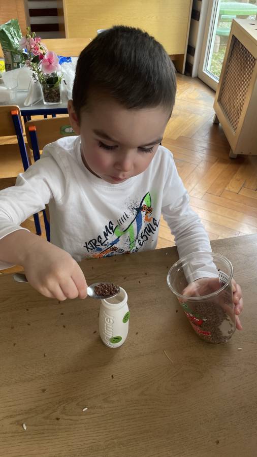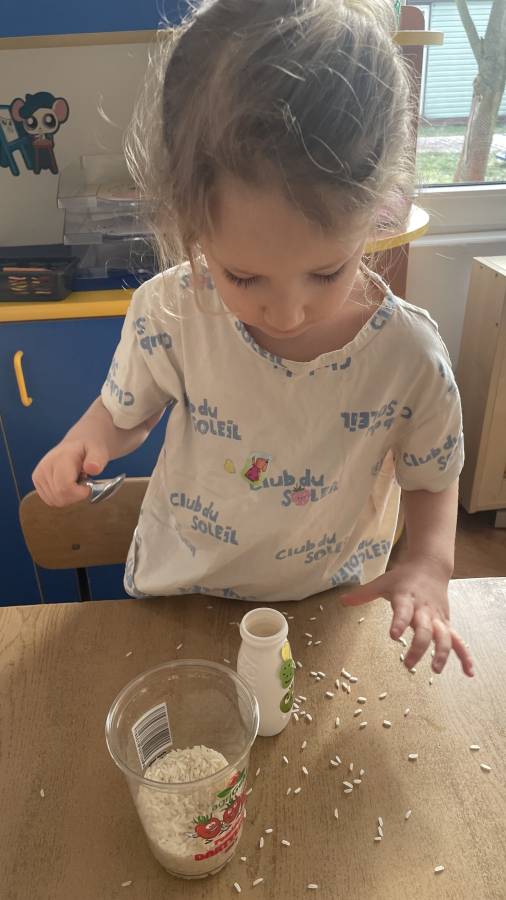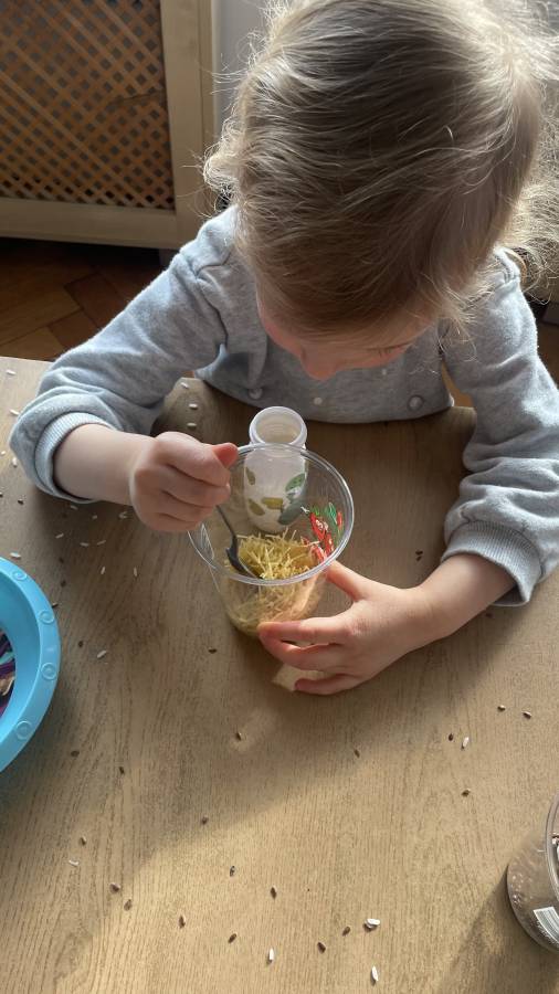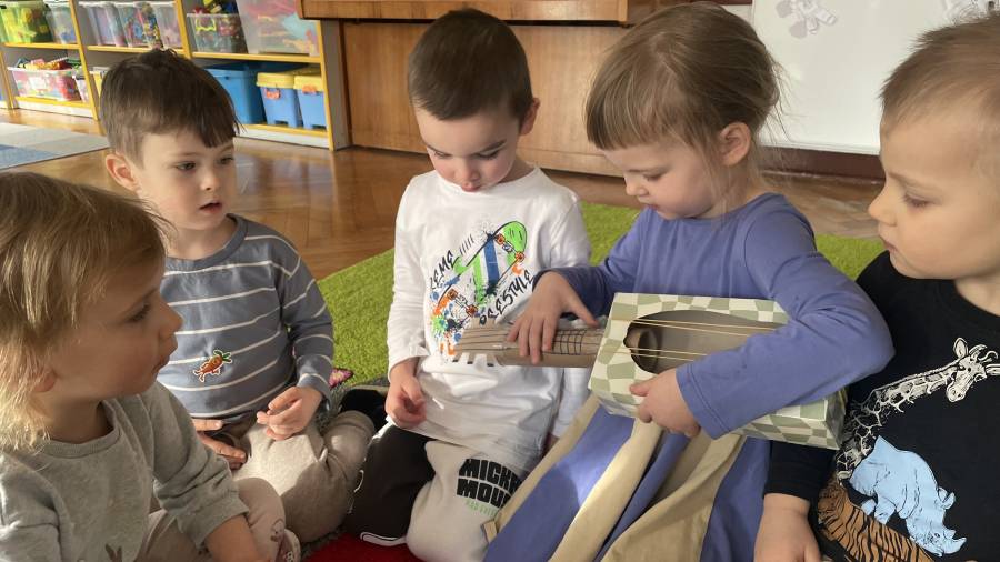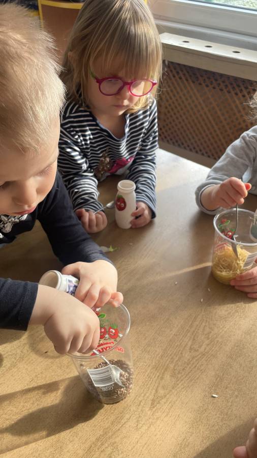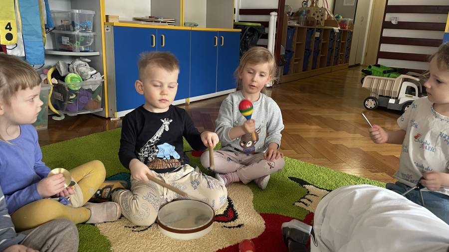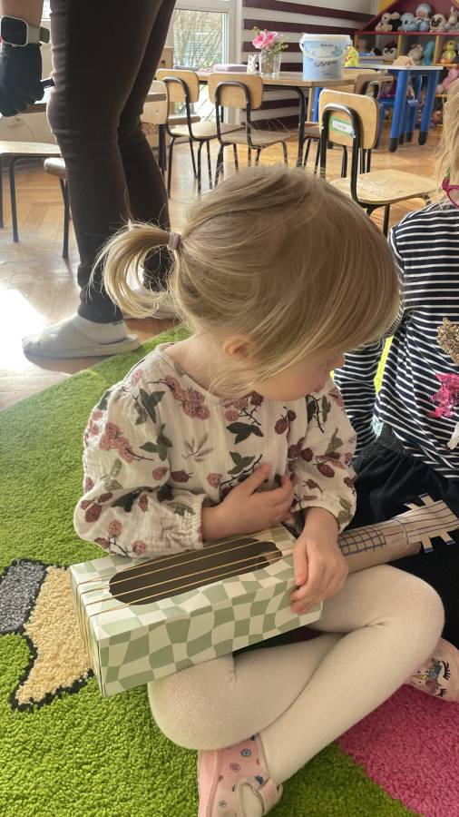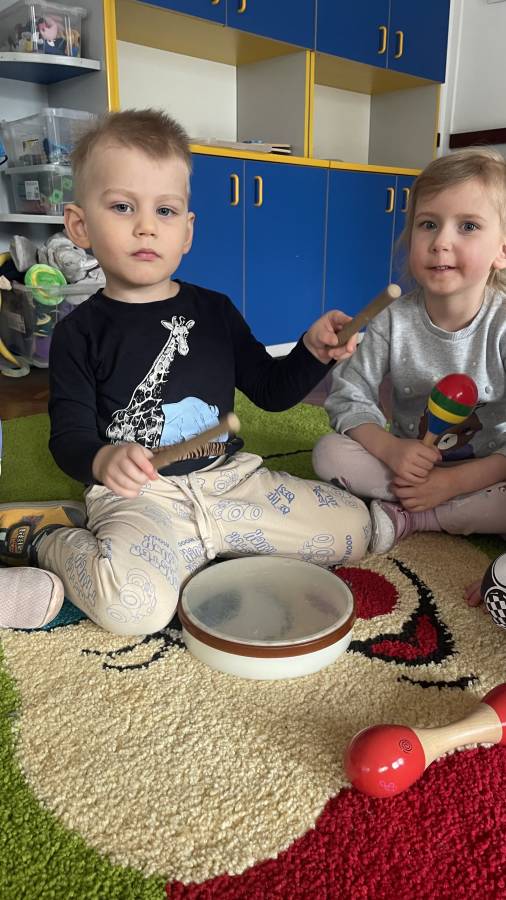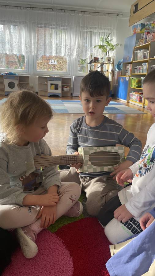 Wyzwanie z jakim się dzisiaj zmierzyliśmy dotyczyło zmysłu słuchu. Zmysł słuchu to jeden z najbardziej fascynujących i jednocześnie niedocenianych zmysłów, który odgrywa kluczową rolę w naszym codziennym życiu. Od dzieciństwa towarzyszy nam w odkrywaniu świata dźwięków – od szumów natury po dźwięki muzyki, czy rozmowy z bliskimi. Wpływa na zdolności komunikacyjne, poznawcze i emocjonalne każdego dziecka. Na dzisiejszych zajęciach rozwijaliśmy zdolności słuchowe poprzez odtwarzanie różnych dźwiękow: odgłosów ulicy, odgłosów sprzętów domowych, codziennych czynności, instrumentów, a także ogłosów natury . Dzieci miały okazję zagrać na wybranych instrumentach, wystukiwać rytmy i śpiewać piosenki do znanych melodii. Pod koniec zajęć dzieci własnoręcznie wykonały grzechotki, wykorzystując butelki po jogurtach, które wypełniły materiałami tj. kasza, makaron, ryż. Wykonaliśmy również gitarę - z pudełka po chusteczkach i rolce po papierze toaletowym. Na koniec zajęć dzieci zagrały na wykonanych przez siebie instrumentach.