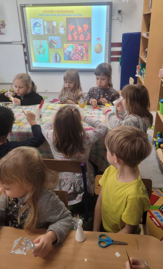Nie zabrakło również zajęć plastycznych, podczas których przedszkolaki tworzyły świąteczne kartki, łańcuchy, gwiazdki oraz inne ozdoby. Kreatywność dzieci nie miała granic – każda praca była wyjątkowa i pełna świątecznego uroku.