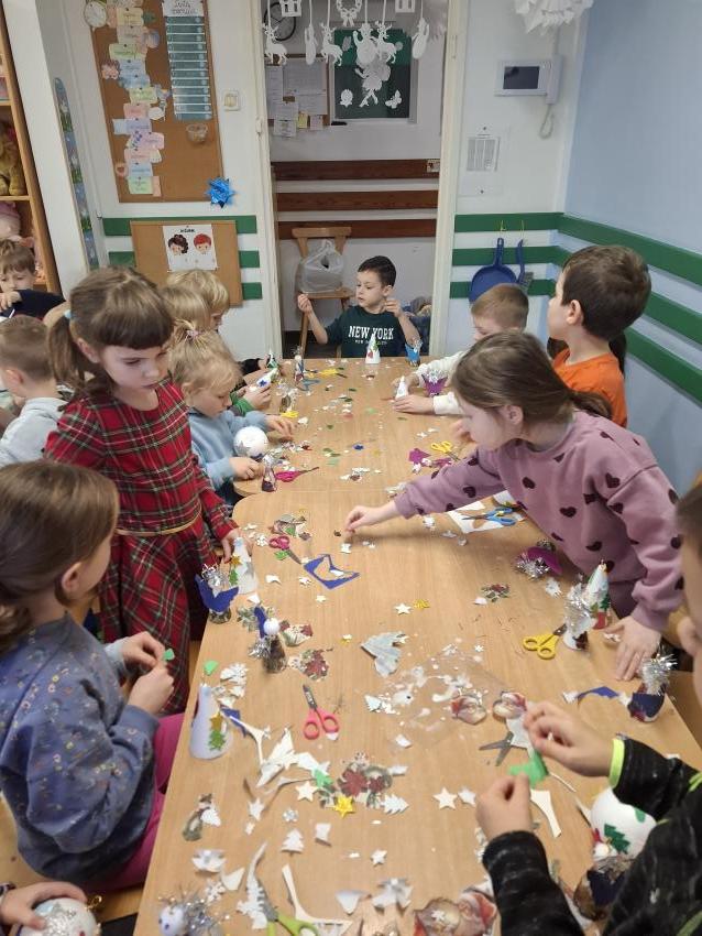 Nie zabrakło również zajęć plastycznych, podczas których przedszkolaki tworzyły świąteczne kartki, łańcuchy, gwiazdki oraz inne ozdoby. Kreatywność dzieci nie miała granic – każda praca była wyjątkowa i pełna świątecznego uroku.