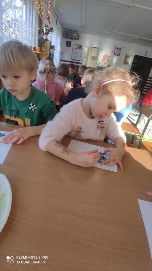 Przedszkolaki z zaangażowaniem przygotowywały kartki bożonarodzeniowe oraz różnorodne dekoracje-barwne bombki, papierowe łańcuchy i subtelne śnieżynki. Wykonały także zimową pracę plastyczną, podczas której rozwijały kreatywność, wyobraźnię oraz zdolności manualne.