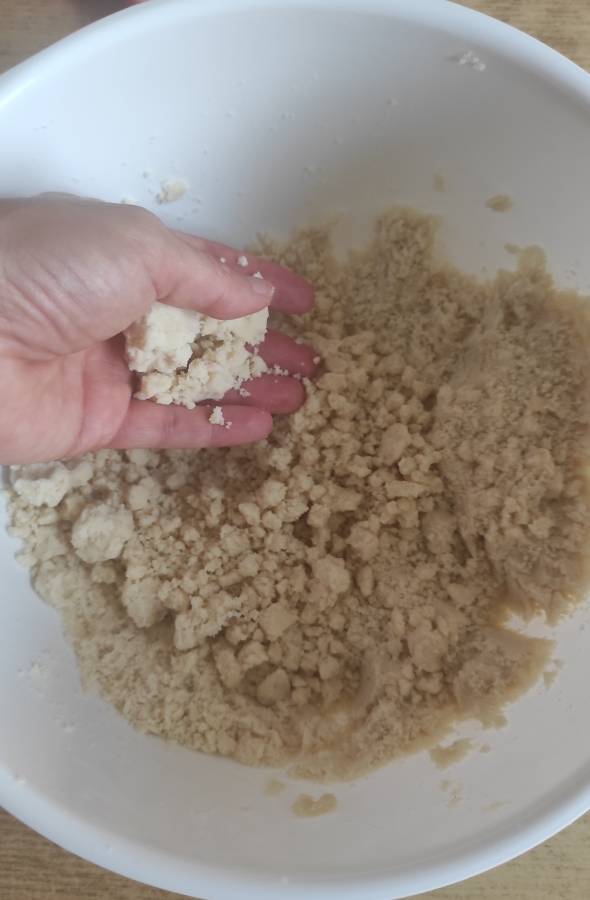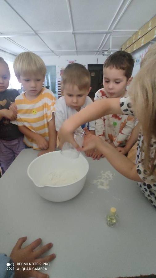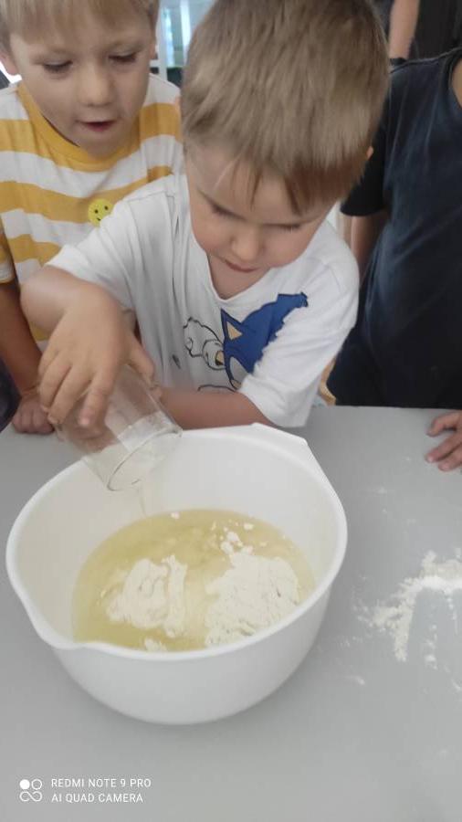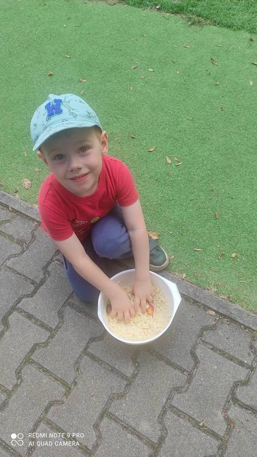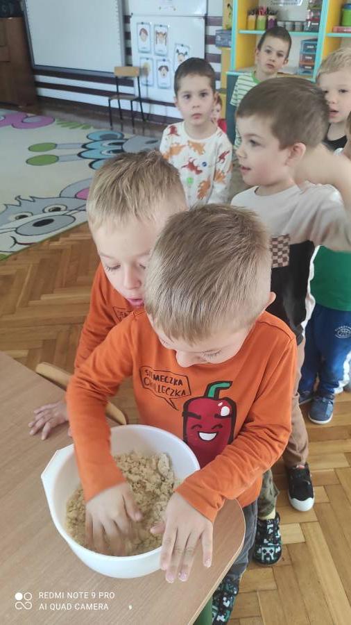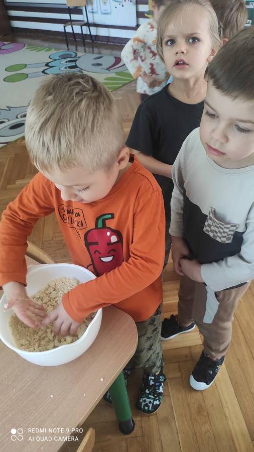 Następnie przedszkolaki przystąpiły do samodzielnego przygotowania magicznego piasku. Wspólnie z nauczycielem dzieci odmierzały i mieszały składniki (mąkę ziemniaczaną, olej oraz olejek zapachowy)