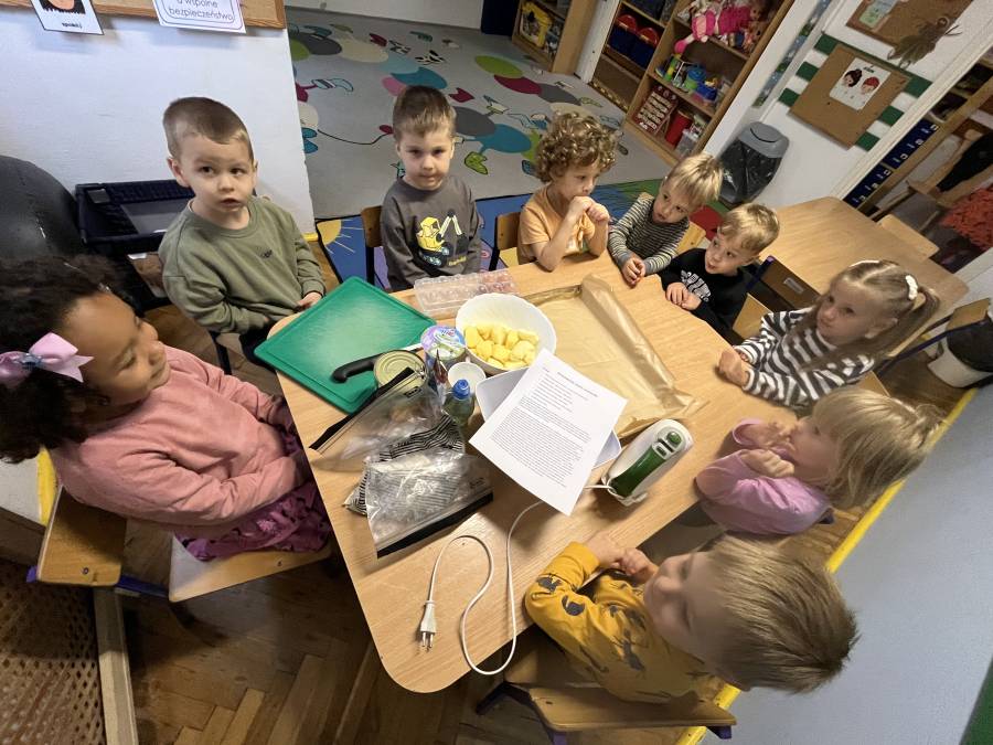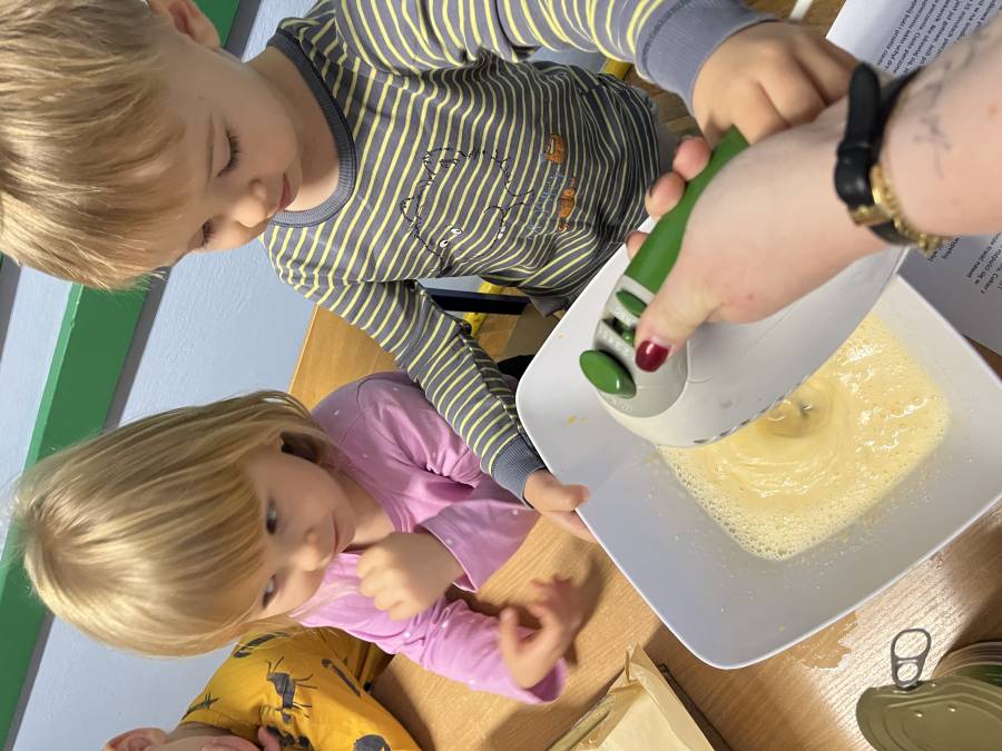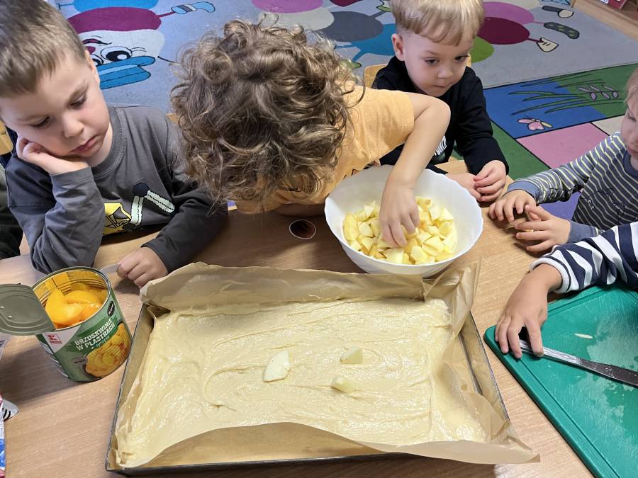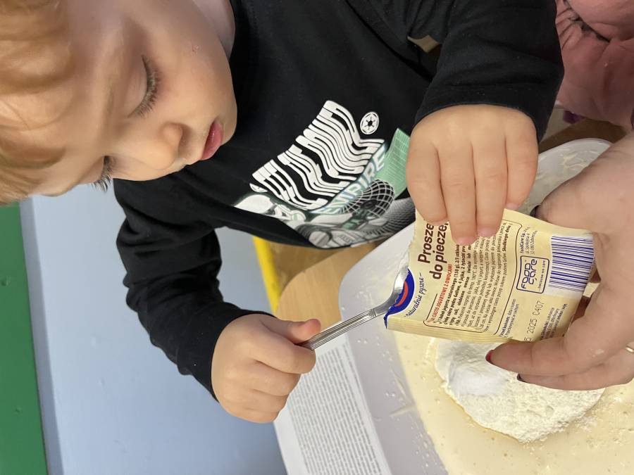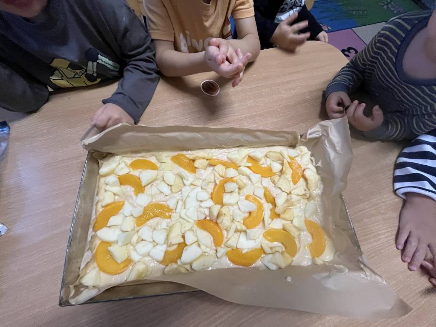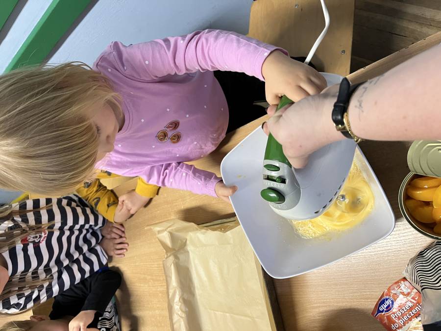 Według przepisu przedszkolaki przygotowały składniki: mąkę, cukier, jaja, olej, cukier waniliowy, proszek do pieczenia, sodę oczyszczoną, olej, jogurt naturalny oraz owoce. Dzieci z wielkim zaangażowaniem wszystko wsypywały, wlewały, mieszały oraz rozkładały owoce. Była to nie tylko doskonała zabawa, ale także cenna lekcja zdrowego odżywiania i współpracy.