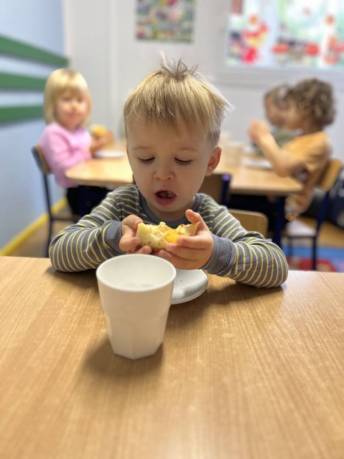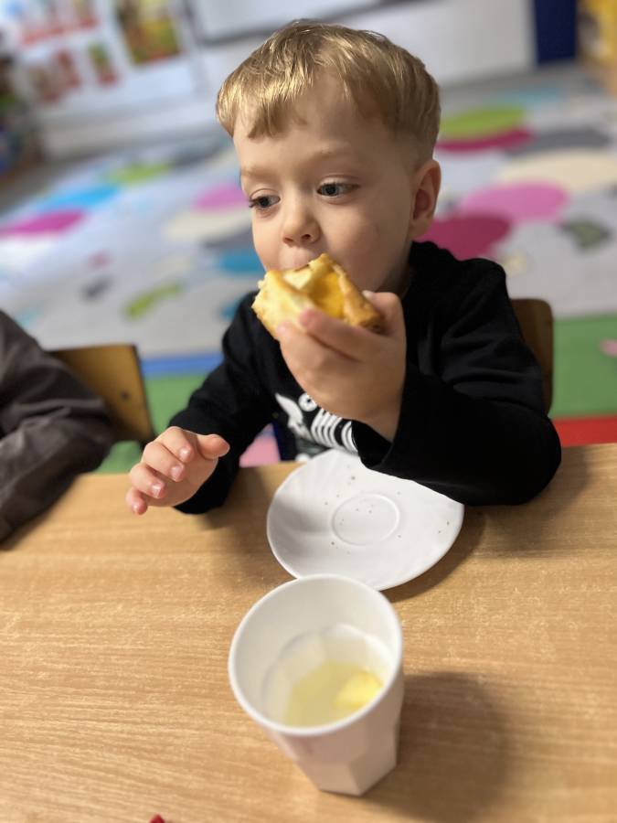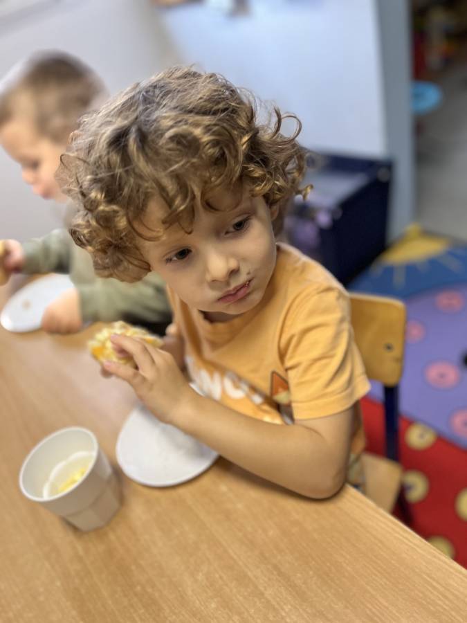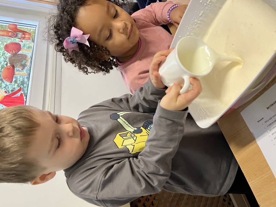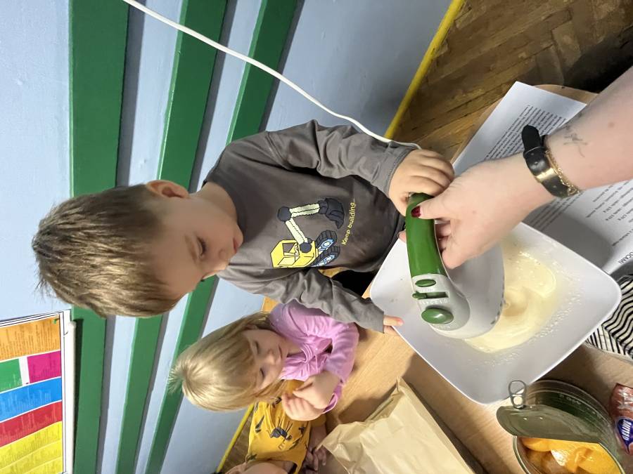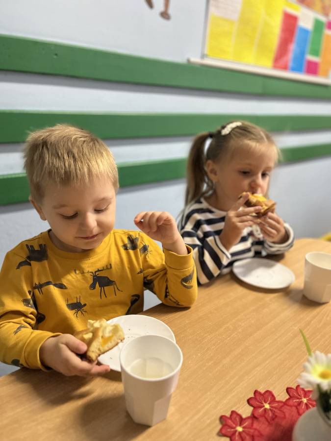 Według przepisu przedszkolaki przygotowały składniki: mąkę, cukier, jaja, olej, cukier waniliowy, proszek do pieczenia, sodę oczyszczoną, olej, jogurt naturalny oraz owoce. Dzieci z wielkim zaangażowaniem wszystko wsypywały, wlewały, mieszały oraz rozkładały owoce. Była to nie tylko doskonała zabawa, ale także cenna lekcja zdrowego odżywiania i współpracy.
