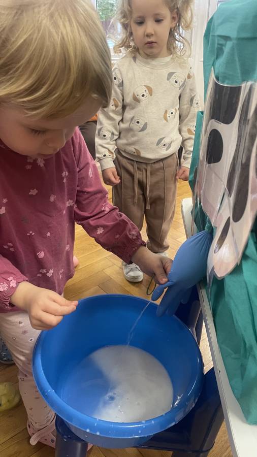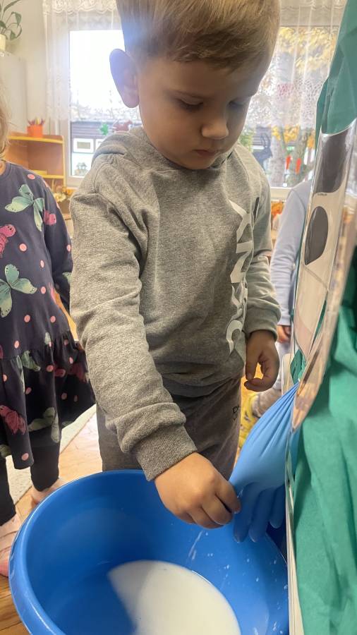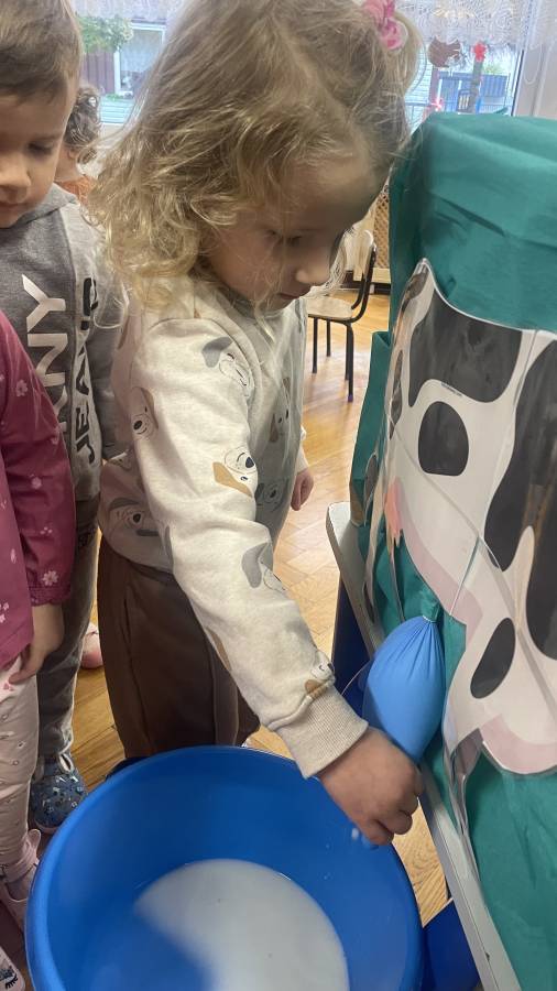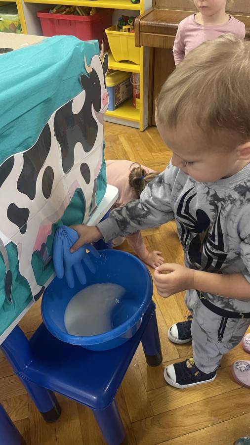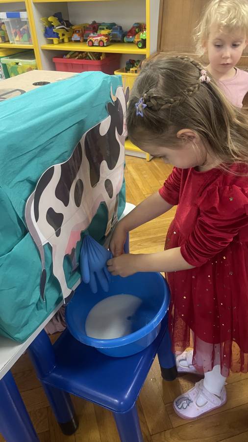 W dniu dzisiejszym grupa Zajączki próbowała odpowiedzieć na pytanie : ,,Skąd się bierze mleko i produkty mleczne?" Dzieci dowiedziały się jaką drogę musi przejść mleko od gospodarstwa , w którym są hodowane krowy, przez przetwórnię mleka, aż po półki sklepowe. Przedszkolaki zapoznały się również ze sposobami wytwarzania produktów mlecznych . Dzięki zabawie sensorycznej ,,Krowa", dzieciaki miały okazję doświadczyć, w jaki sposób można wydoić krowę. Nie było łatwo, ale Zajączki świetnie sobie poradziły.