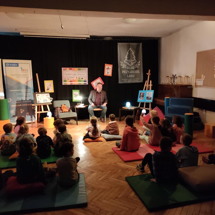 22 października 2025 roku dzieci z grupy "Smoki" na zaproszenia dytektora Młodzieżowego Domu Kultury "Dom Harcerza" na ul. Lotniczej uczestniczyły w akcji promującej czytelnictwo "Dytektor czyta dzieciom".Wydarzenie ma na celu zachęcanie najmłodszych do czytania, i budowania pozytywnych skojarzeń z książkami. Dyrektor Domu Kultury przyniósł książeczki z własnej domowej biblioteczki. Dzieci wysłuchały "Historii o smoku wawelskim" oraz fragmentu przygód małpki fiiki-Miki. Obie książeczki autorstwa Kornela Makuszyńskiego. Bardzo dziękujemy za zaproszenie.