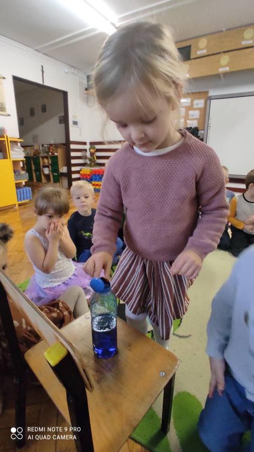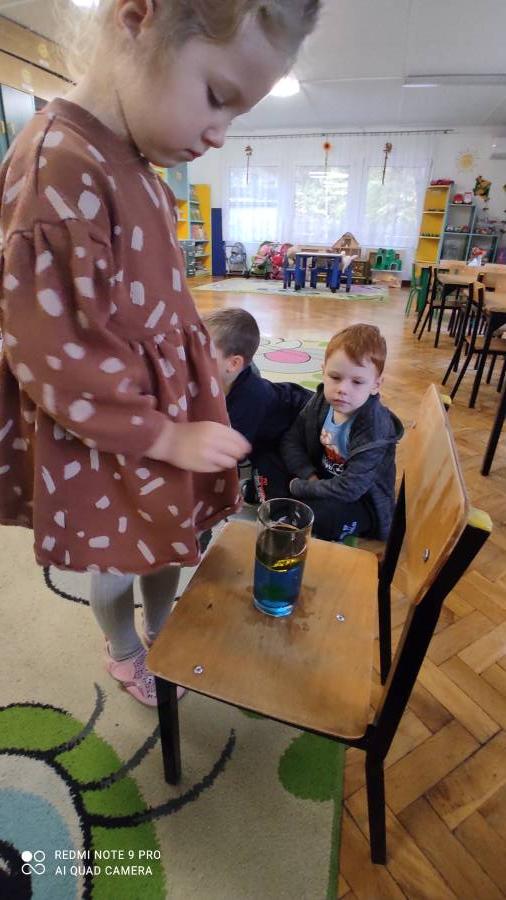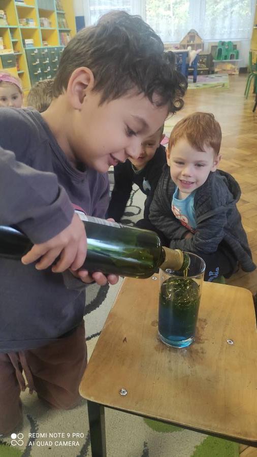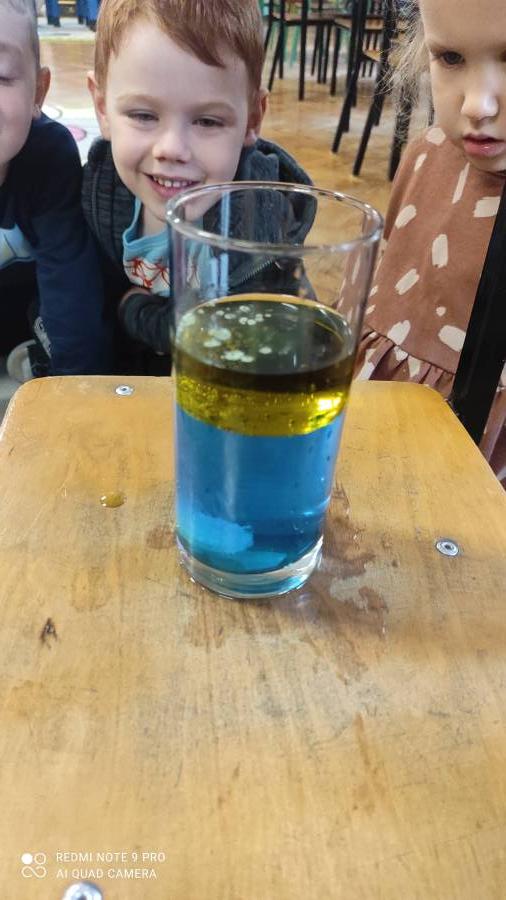 Później nadszedł czas na prawdziwe wodne eksperymenty! Najpierw wykonaliśmy lampę lawę, obserwując, jak kolorowa woda i olej tworzą w szklance magiczne, poruszające się bąbelki.