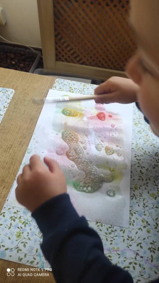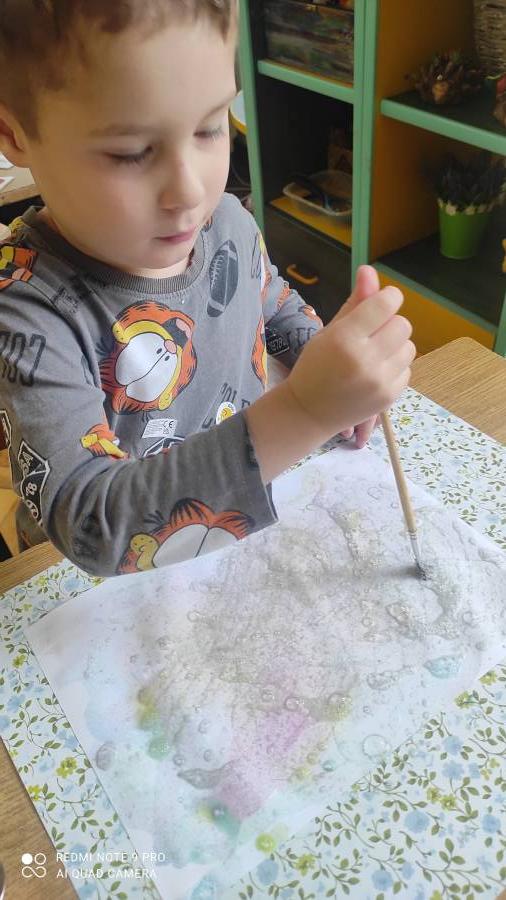 Na zakończenie każdy mały artysta stworzył własne „wodne impresje” – barwne kompozycje malowane pianą Powstały prace pełne kolorów i fantazji!