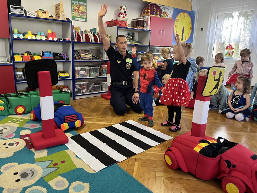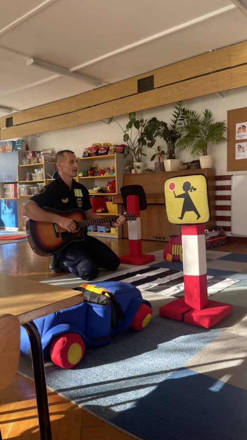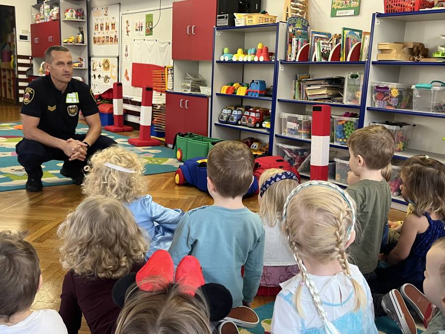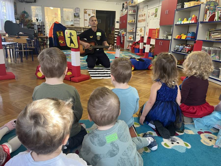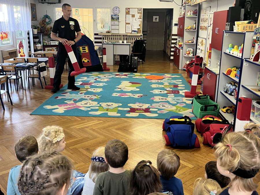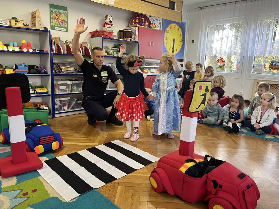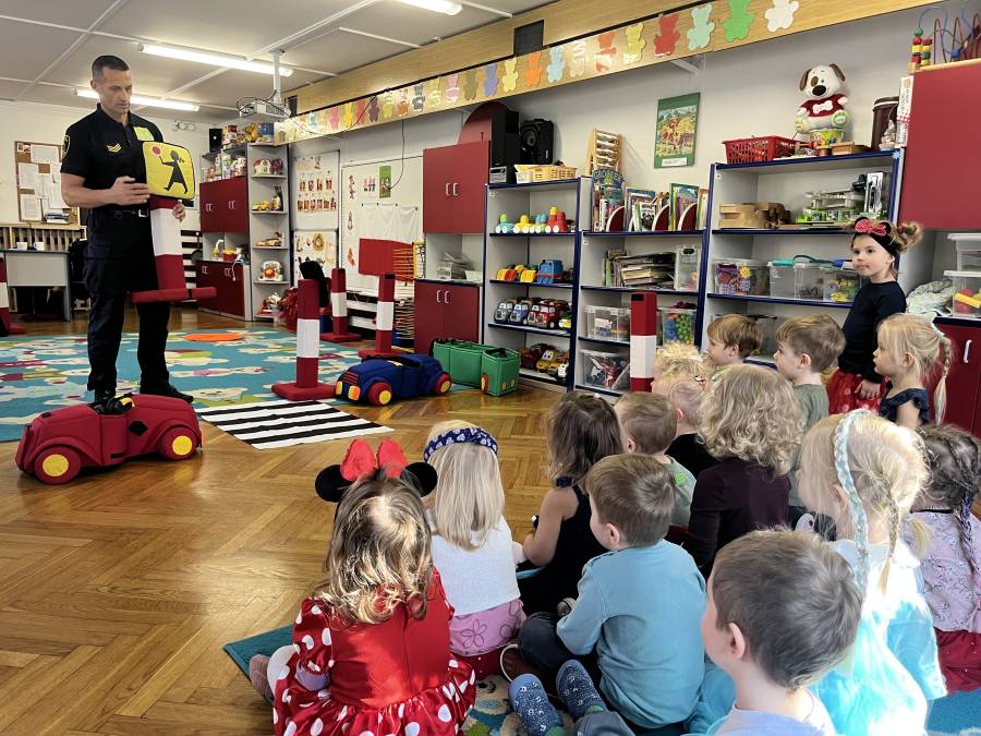Pan Strażnik opowiedział dzieciom, jak należy zachowywać się podczas przechodzenia przez jezdnię, jak rozpoznawać sygnały świetlne oraz co oznaczają znaki drogowe. Przedszkolaki dowiedziały się również, dlaczego tak ważne jest noszenie elementów odblaskowych i zapinanie pasów bezpieczeństwa w samochodzie. Chętne dzieci miały możliwość praktycznie zastosować utrwaloną wiedzę uczestnicząc w zabawie dydaktycznej "Bezpieczne miasto"