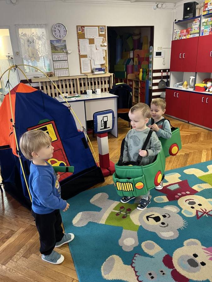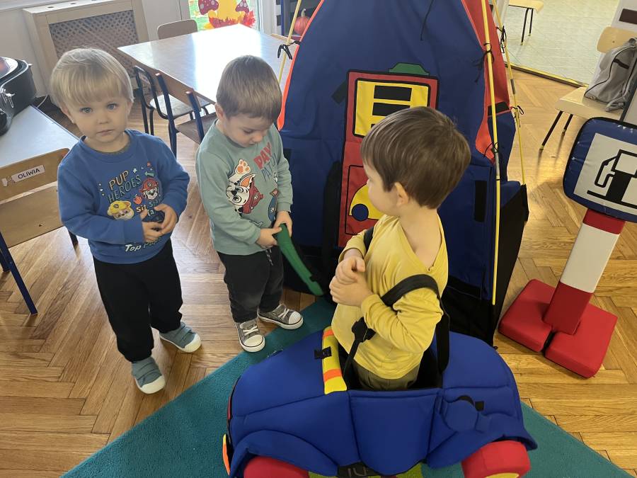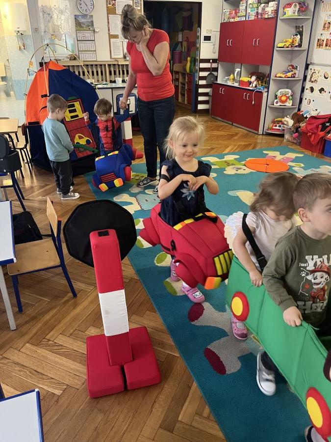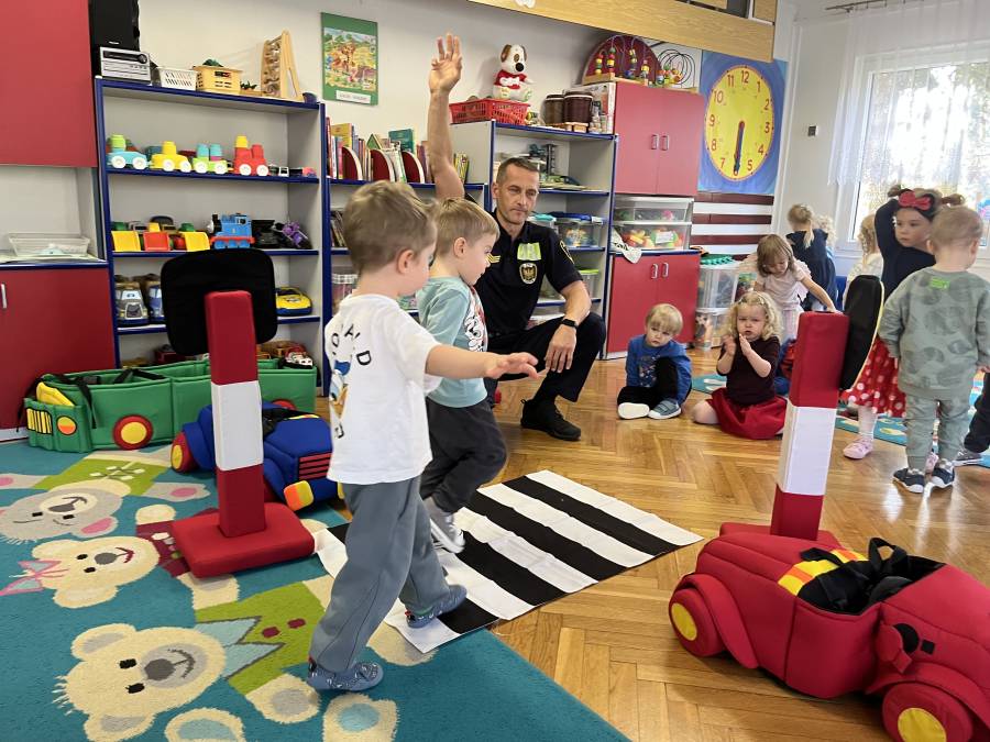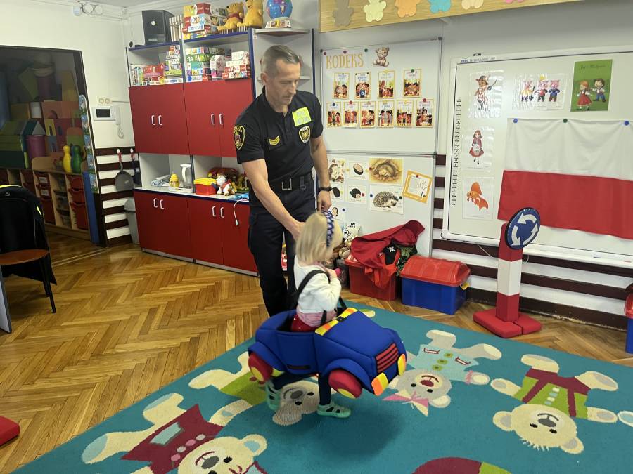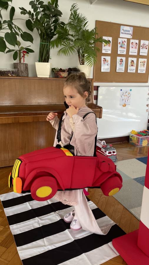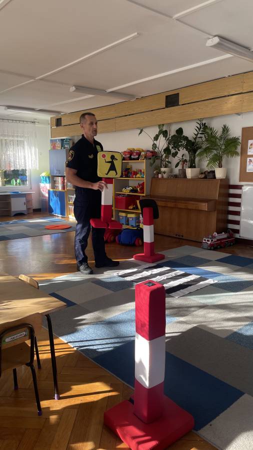 Pan Strażnik opowiedział dzieciom, jak należy zachowywać się podczas przechodzenia przez jezdnię, jak rozpoznawać sygnały świetlne oraz co oznaczają znaki drogowe. Przedszkolaki dowiedziały się również, dlaczego tak ważne jest noszenie elementów odblaskowych i zapinanie pasów bezpieczeństwa w samochodzie. Chętne dzieci miały możliwość praktycznie zastosować utrwaloną wiedzę uczestnicząc w zabawie dydaktycznej "Bezpieczne miasto"
