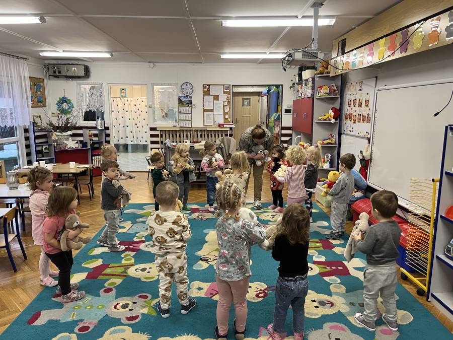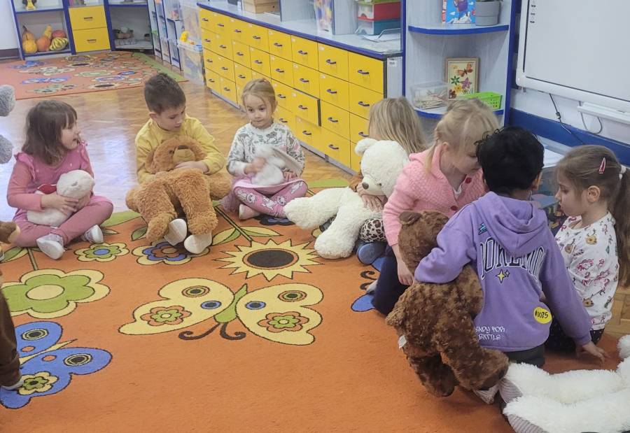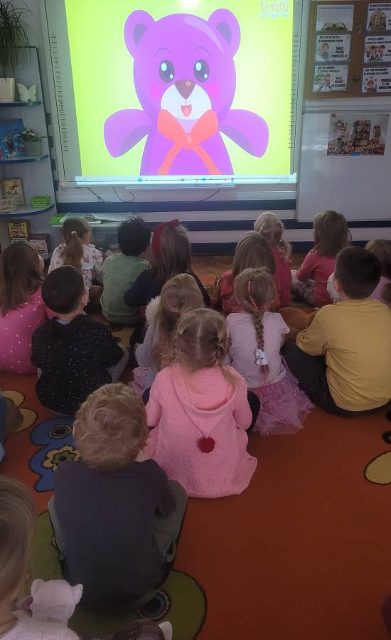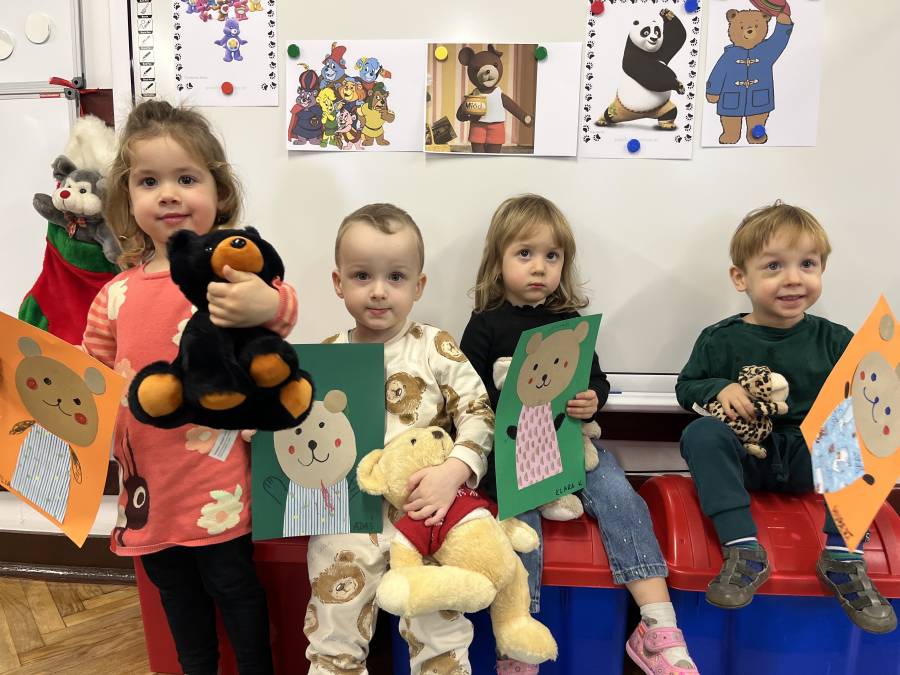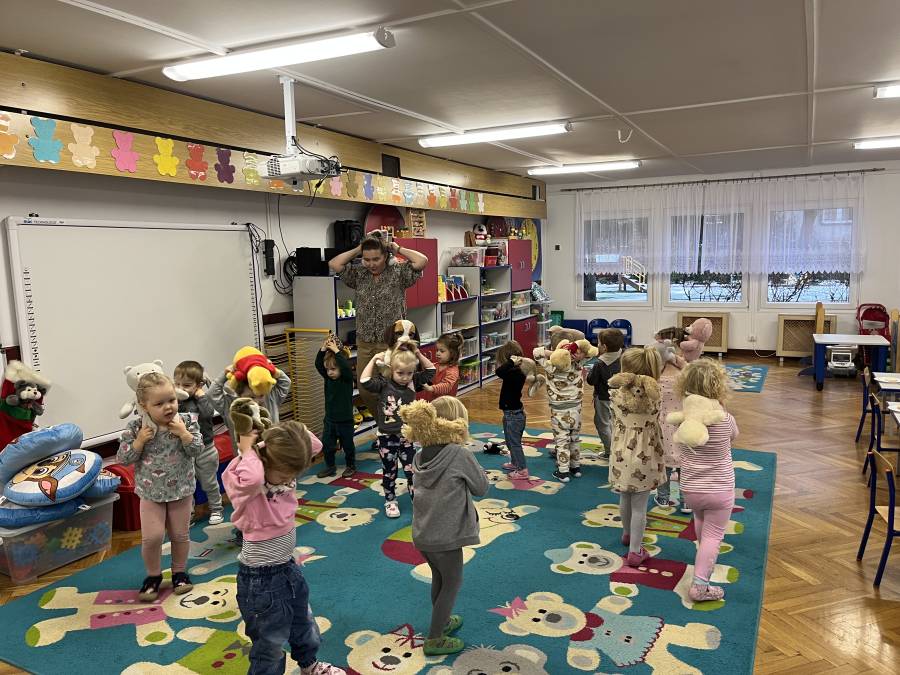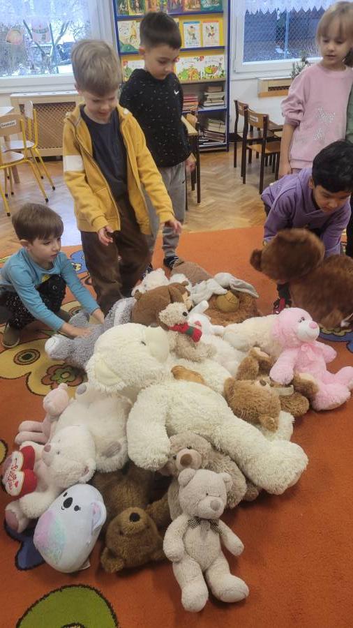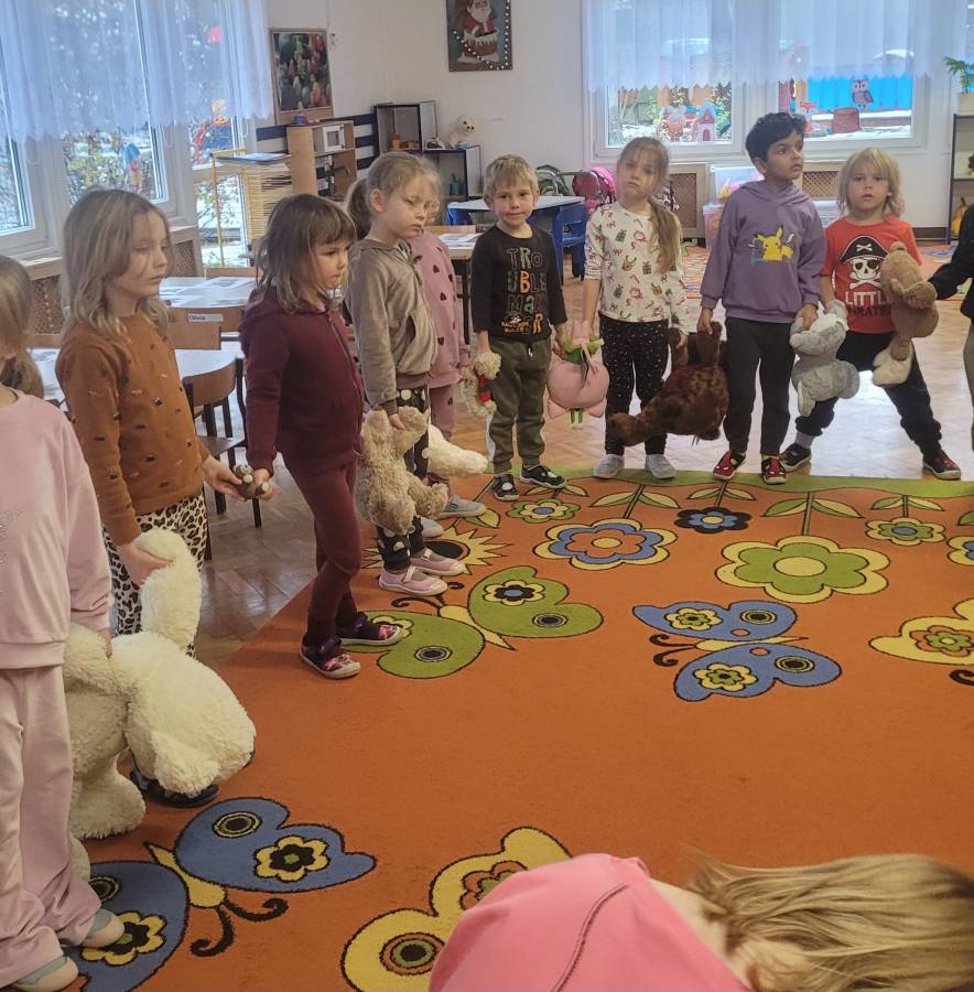 Podczas zajęć dzieci dowiedziały się, dlaczego obchodzimy Dzień Pluszowego Misia. Poznały historię powstania pierwszego misia – od opowieści o prezydencie Theodore’u Roosevelcie, który podczas polowania wypuścił małego niedźwiadka, aż po stworzenie pierwszej pluszowej zabawki nazwanej „Teddy Bear”. Przedszkolaki z zainteresowaniem wysłuchały tej historii i chętnie odpowiadały na pytania.