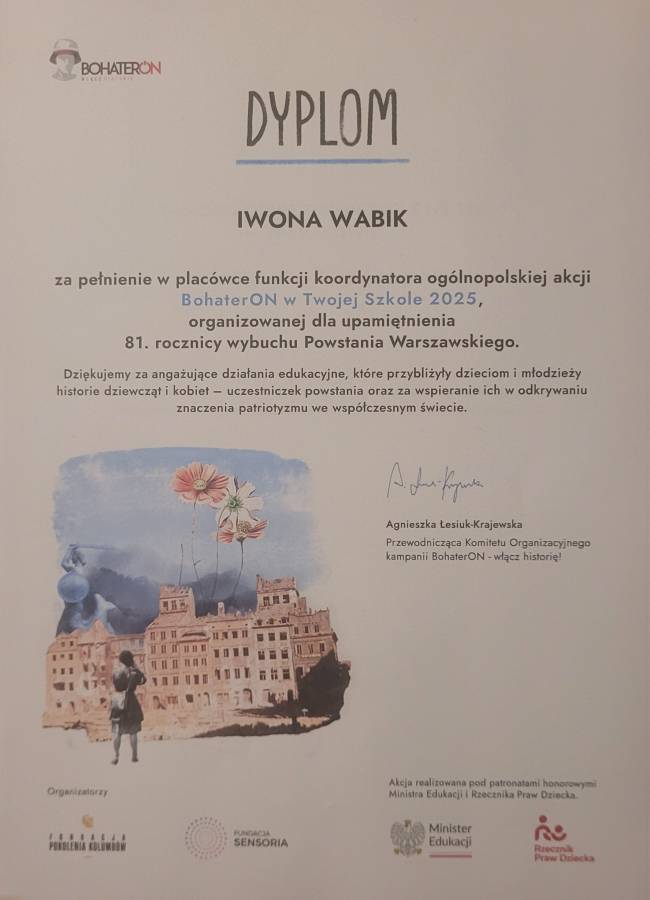 Z radością informujemy, że nasze Przedszkole otrzymało dyplom z podziękowaniem za udział w ogólnopolskiej kampanii BohaterON – włącz historię!, której celem jest popularyzacja wiedzy o dziejach Polski XX wieku, a szczególnie o Powstaniu Warszawskim. Tegoroczna edycja poświęcona była kobietom w Powstaniu Warszawskim – sanitariuszkom, łączniczkom, dowódczyniom i uczestniczkom codziennej walki o przetrwanie rodzin.