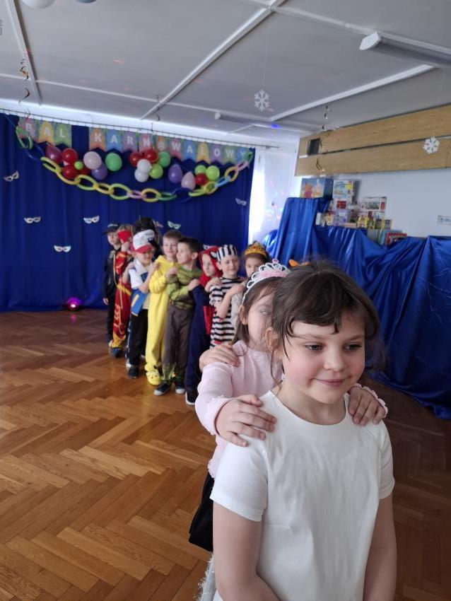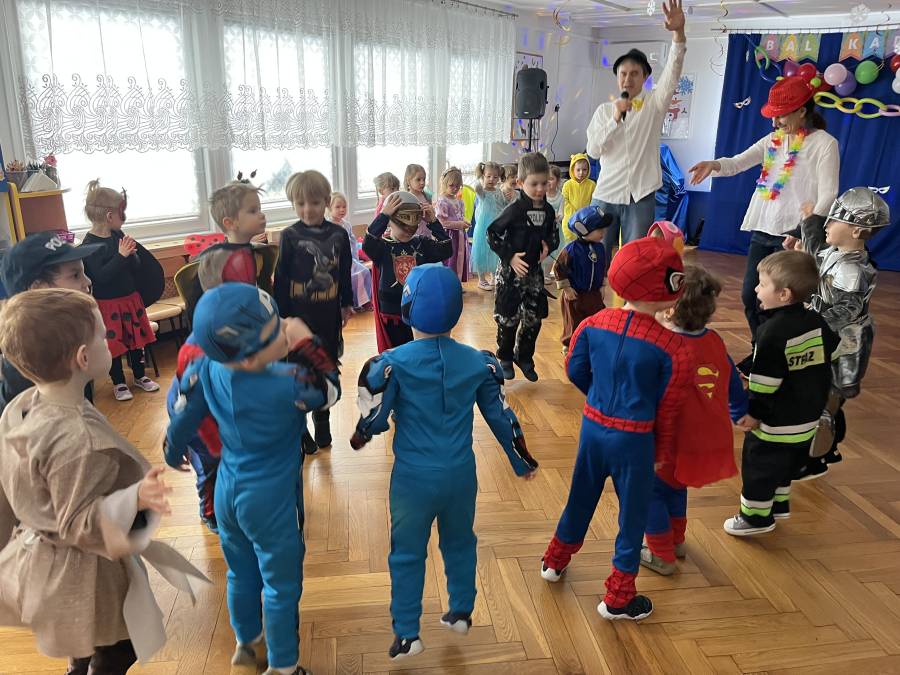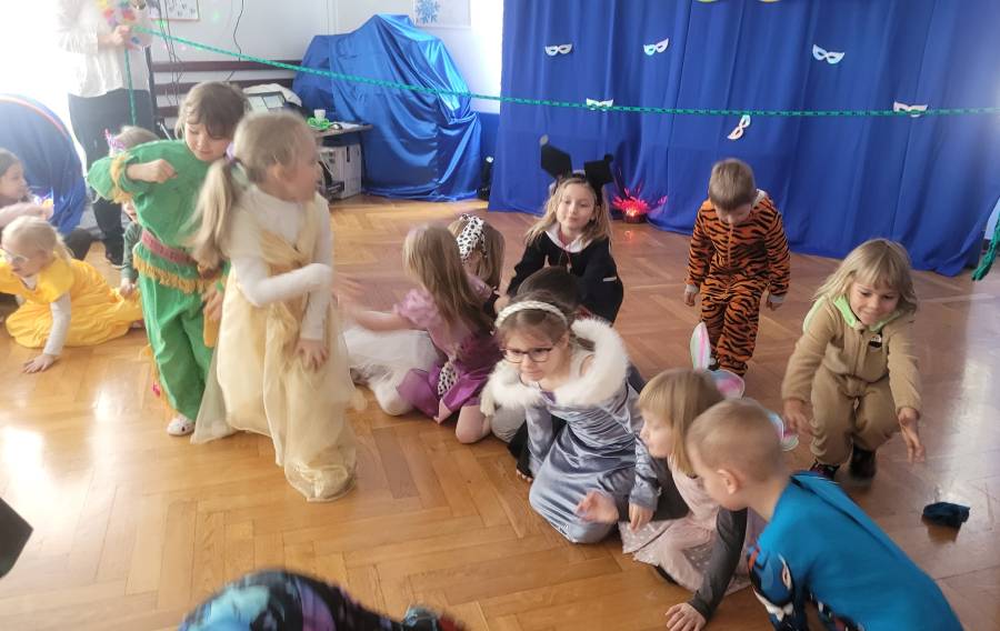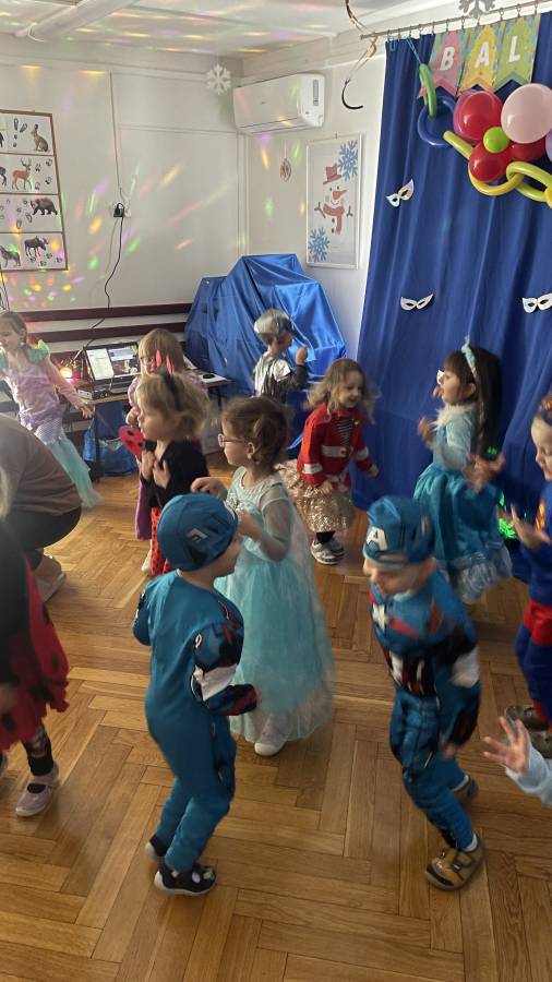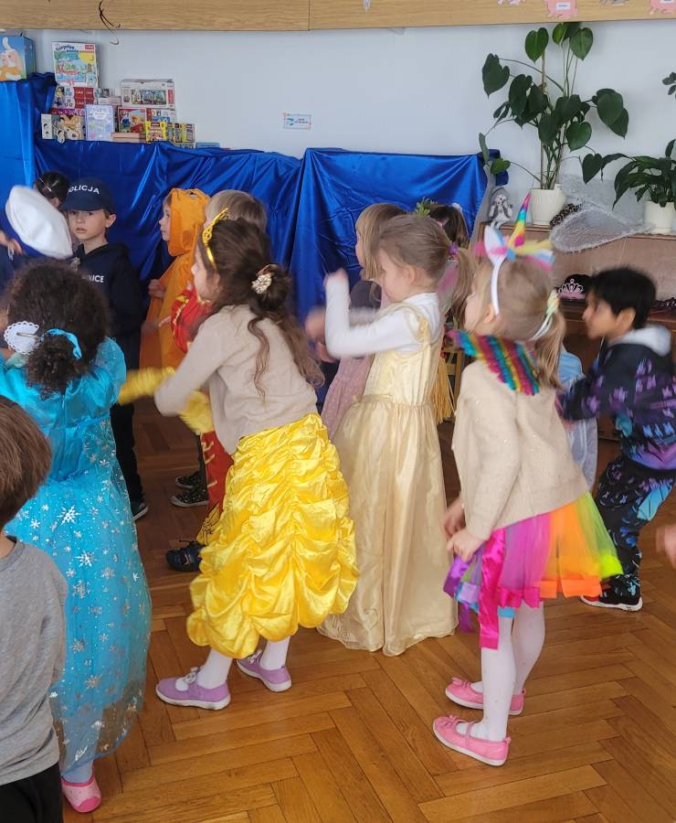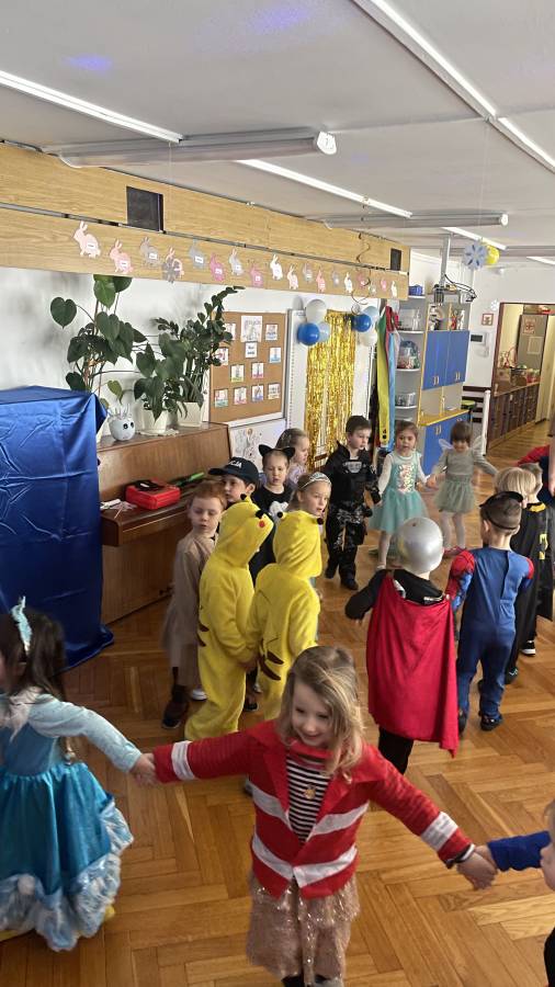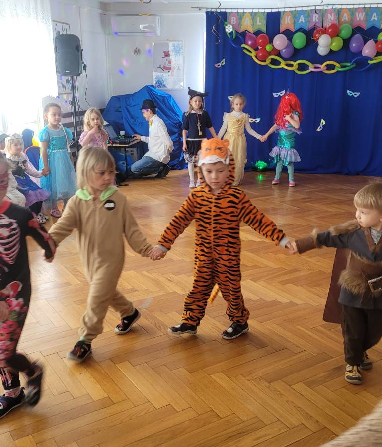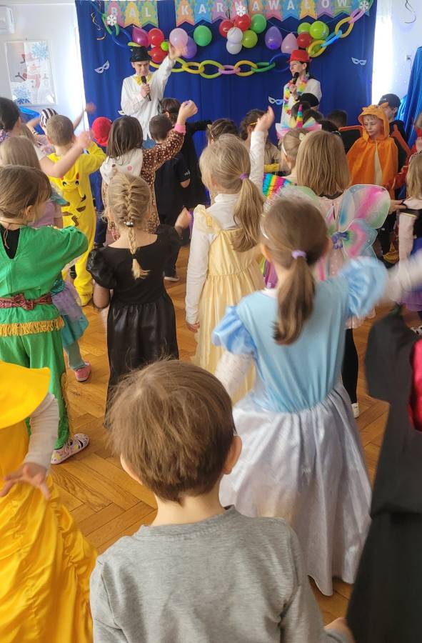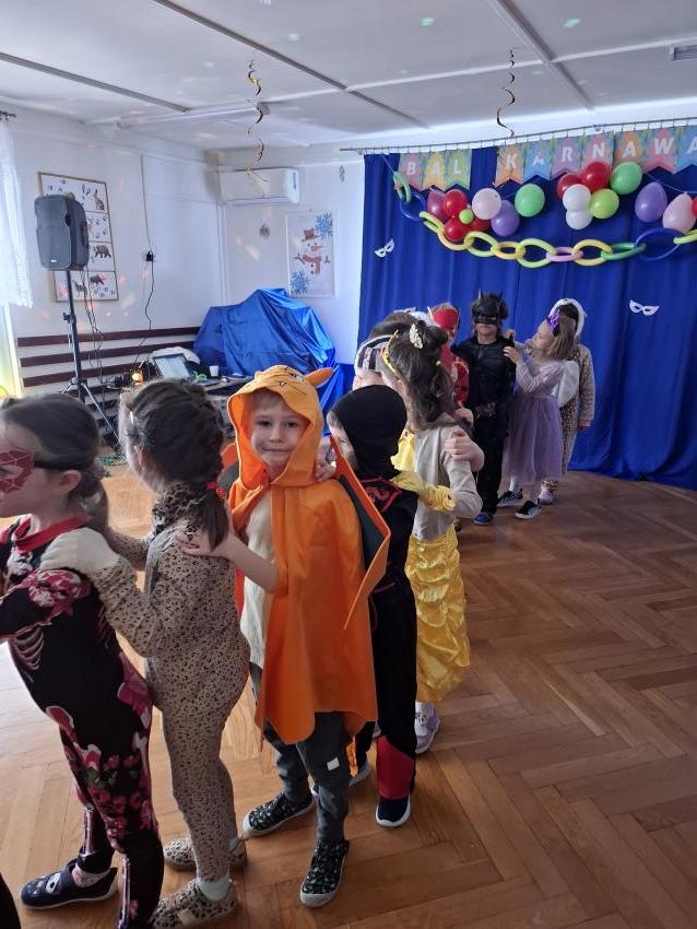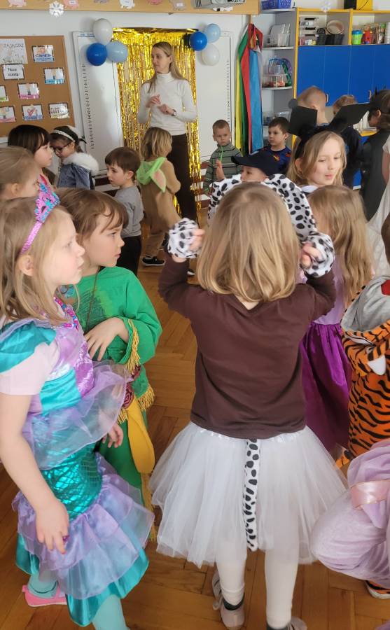 16 lutego w naszym Przedszkolu odbył się długo wyczekiwany Bal Karnawałowy. Tego dnia już od samego rana w salach panowała radosna atmosfera, a dzieci z dumą prezentowały swoje kolorowe i pomysłowe stroje. Wśród uczestników można było spotkać księżniczki, superbohaterów, zwierzątka, wróżki, policjantów, strażaków, a nawet postacie z ulubionych bajek. Sala balowa została pięknie udekorowana balonami, serpentynami i błyszczącymi ozdobami. Muzyka zachęcała do tańca, a dzieci z ogromnym entuzjazmem brały udział w przygotowanych zabawach. Dużo śmiechu przyniosło przechodzenie pod liną oraz pokonywanie kolorowego tunelu. Bal Karnawałowy był pełen radości, tańca i niezapomnianych wrażeń. To był wspaniały dzień, który na długo pozostanie w pamięci naszych przedszkolaków.