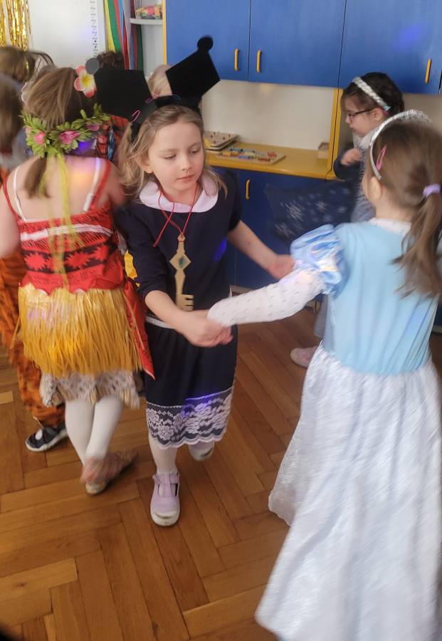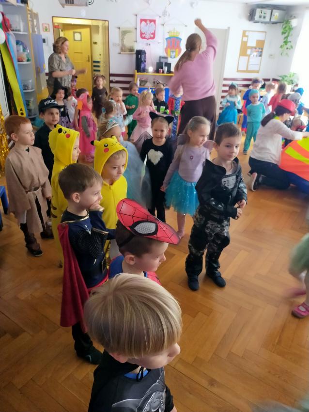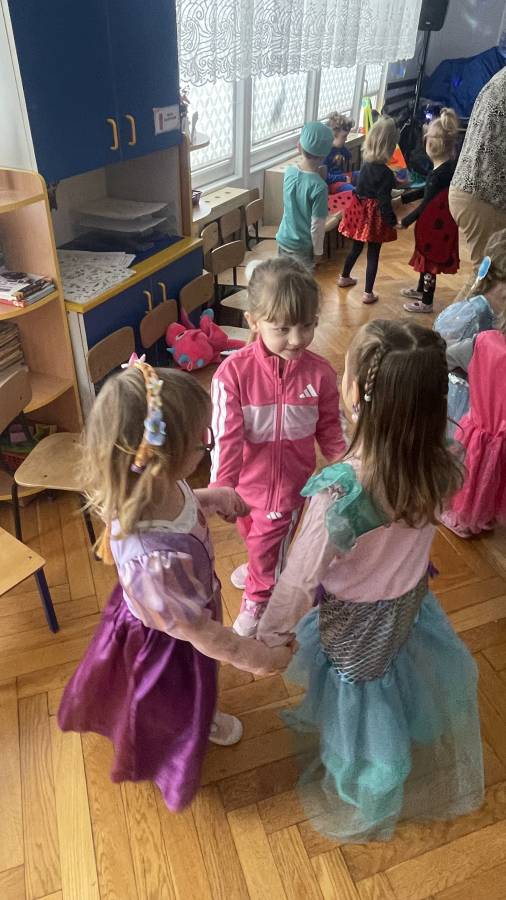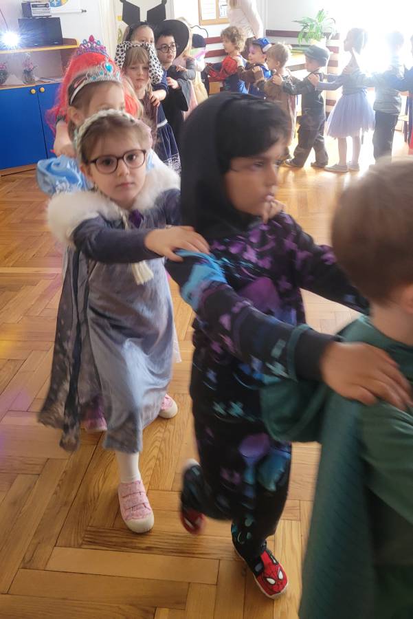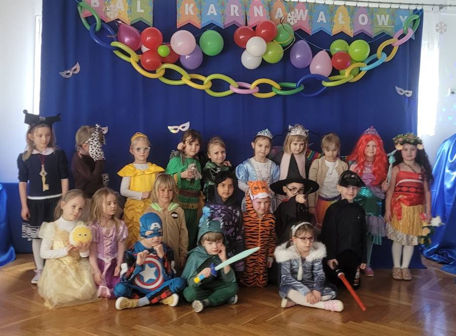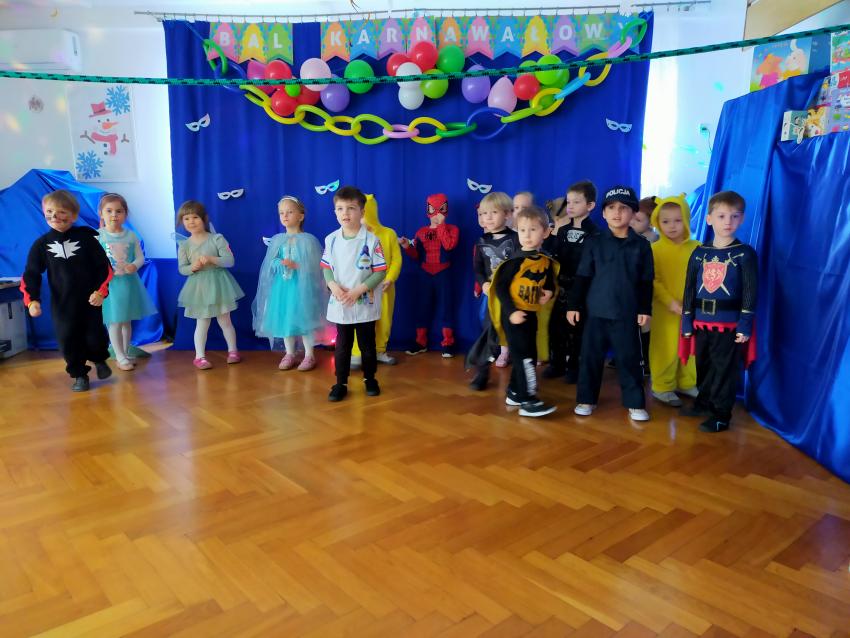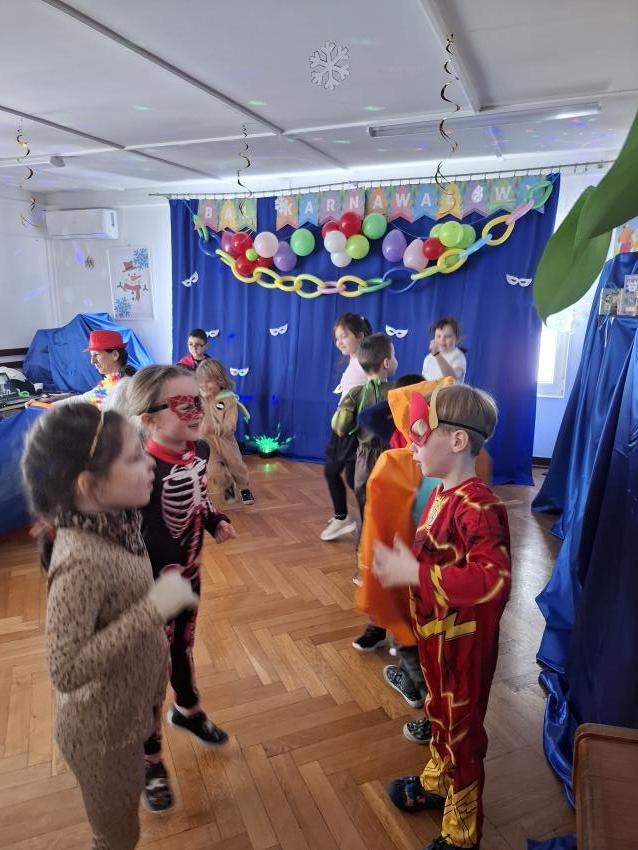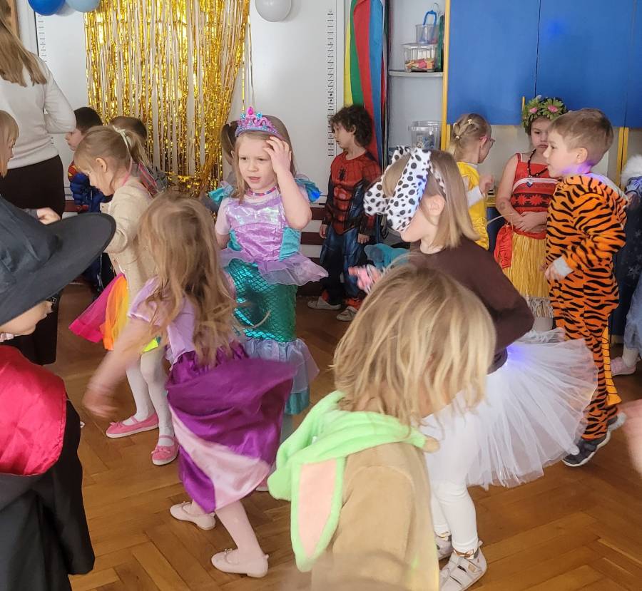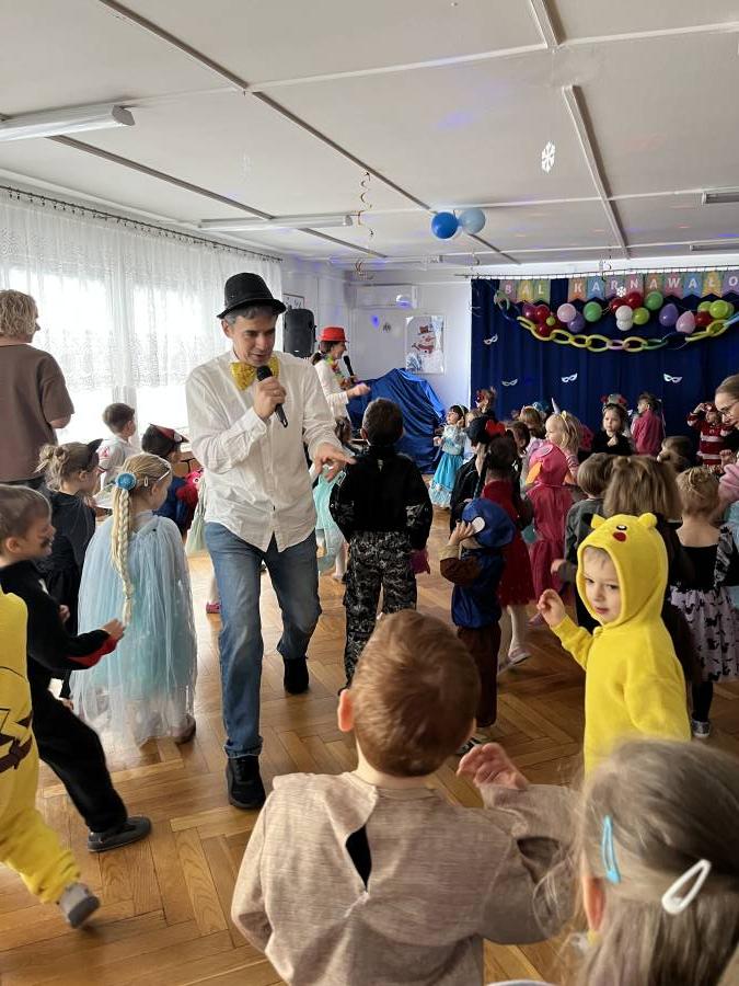 16 lutego w naszym Przedszkolu odbył się długo wyczekiwany Bal Karnawałowy. Tego dnia już od samego rana w salach panowała radosna atmosfera, a dzieci z dumą prezentowały swoje kolorowe i pomysłowe stroje. Wśród uczestników można było spotkać księżniczki, superbohaterów, zwierzątka, wróżki, policjantów, strażaków, a nawet postacie z ulubionych bajek. Sala balowa została pięknie udekorowana balonami, serpentynami i błyszczącymi ozdobami. Muzyka zachęcała do tańca, a dzieci z ogromnym entuzjazmem brały udział w przygotowanych zabawach. Dużo śmiechu przyniosło przechodzenie pod liną oraz pokonywanie kolorowego tunelu. Bal Karnawałowy był pełen radości, tańca i niezapomnianych wrażeń. To był wspaniały dzień, który na długo pozostanie w pamięci naszych przedszkolaków.